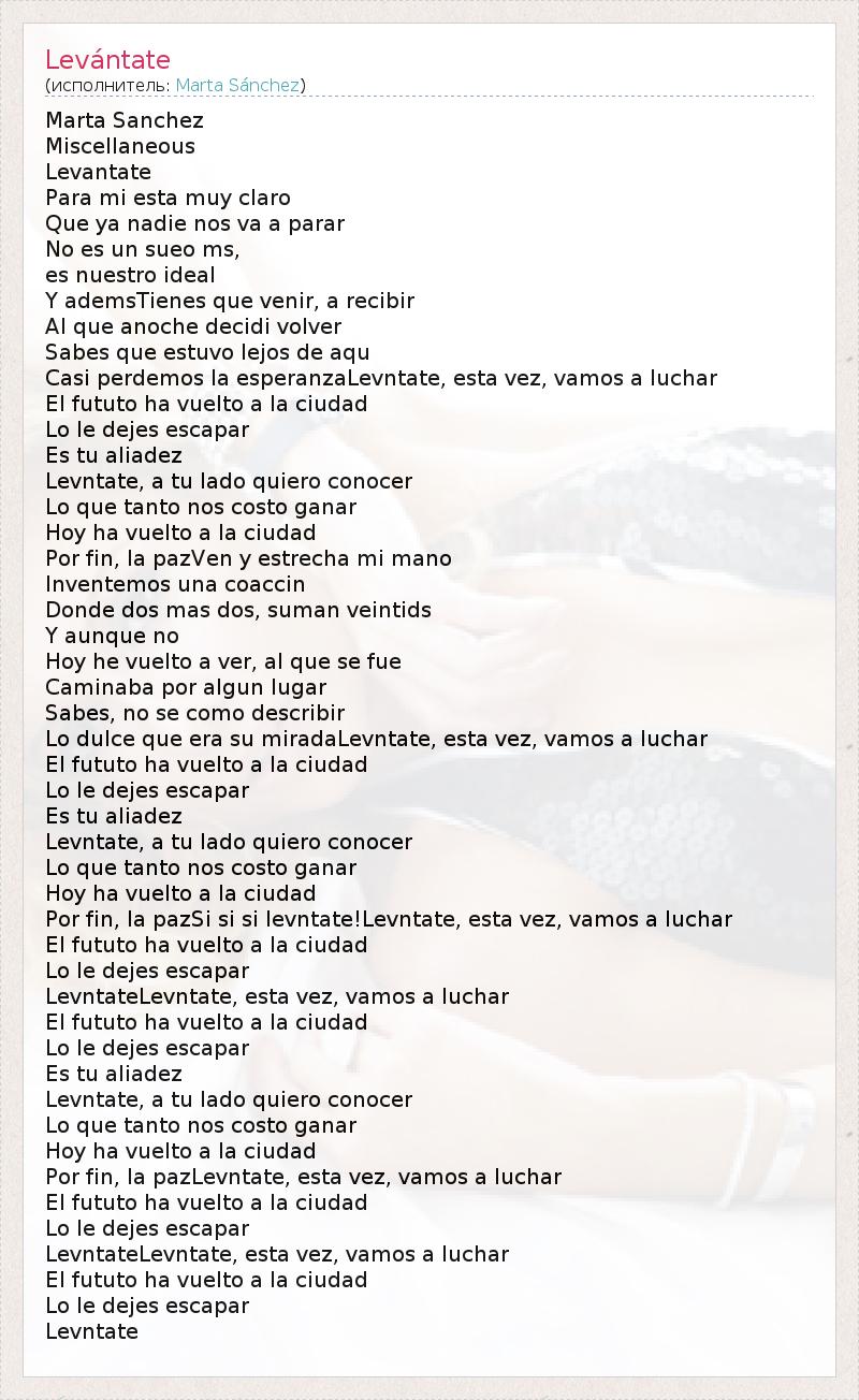 Marta Sanchez Miscellaneous Levantate Para mi esta muy claro Que ya nadie nos va a parar No es un sueo ms, es nuestro ideal Y ademsTienes que venir, a recibir Al que anoche decidi volver Sabes que estuvo lejos de aqu Casi perdemos la esperanzaLevntate, esta vez, vamos a luchar El fututo ha vuelto a la ciudad Lo le dejes escapar Es tu aliadez Levntate, a tu lado quiero conocer Lo que tanto nos costo ganar Hoy ha vuelto a la ciudad Por fin, la pazVen y estrecha mi mano Inventemos una coaccin Donde dos mas dos, suman veintids Y aunque no Hoy he vuelto a ver, al que se fue Caminaba por algun lugar Sabes, no se como describir Lo dulce que era su miradaLevntate, esta vez, vamos a luchar El fututo ha vuelto a la ciudad Lo le dejes escapar Es tu aliadez Levntate, a tu lado quiero conocer Lo que tanto nos costo ganar Hoy ha vuelto a la ciudad Por fin, la pazSi si si levntate!Levntate, esta vez, vamos a luchar El fututo ha vuelto a la ciudad Lo le dejes escapar LevntateLevntate, esta vez, vamos a luchar El fututo ha vuelto a la ciudad Lo le dejes escapar Es tu aliadez Levntate, a tu lado quiero conocer Lo que tanto nos costo ganar Hoy ha vuelto a la ciudad Por fin, la pazLevntate, esta vez, vamos a luchar El fututo ha vuelto a la ciudad Lo le dejes escapar LevntateLevntate, esta vez, vamos a luchar El fututo ha vuelto a la ciudad Lo le dejes escapar Levntate