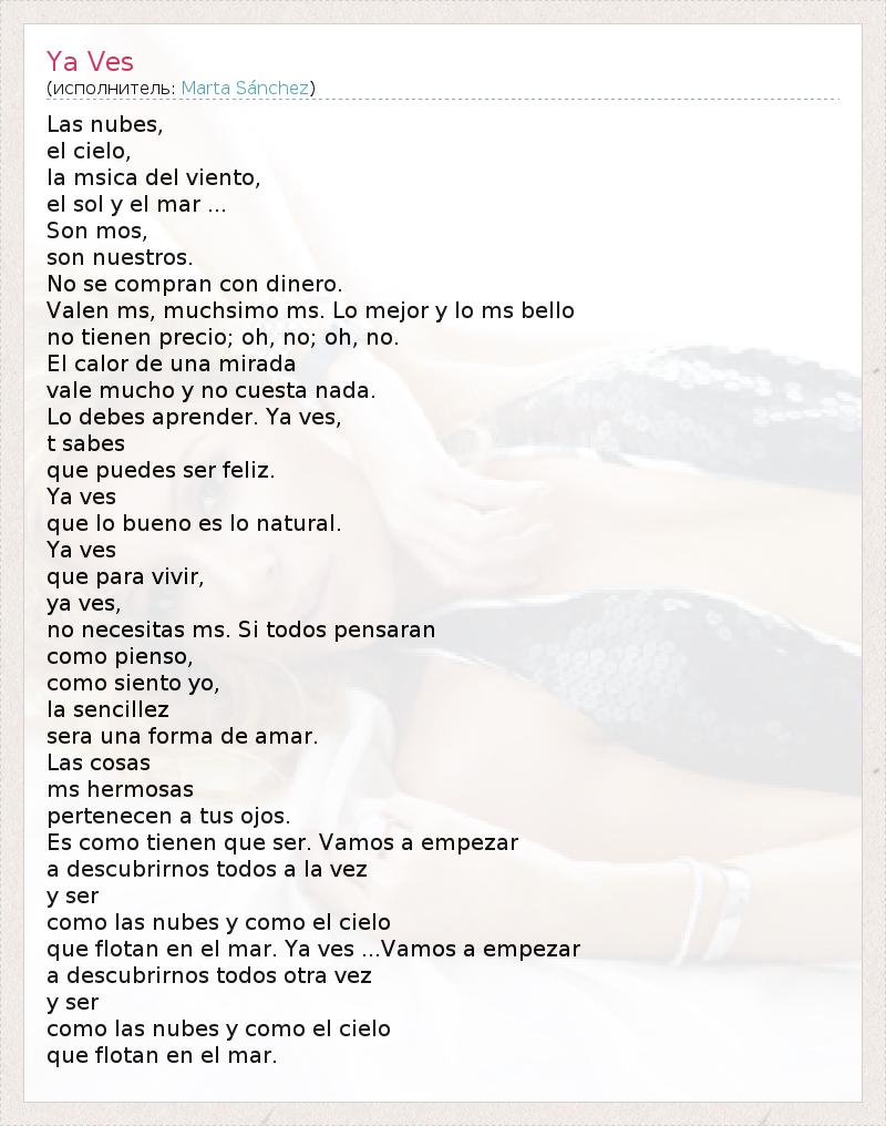 Las nubes, el cielo, la msica del viento, el sol y el mar ... Son mos, son nuestros. No se compran con dinero. Valen ms, muchsimo ms. Lo mejor y lo ms bello no tienen precio; oh, no; oh, no. El calor de una mirada vale mucho y no cuesta nada. Lo debes aprender. Ya ves, t sabes que puedes ser feliz. Ya ves que lo bueno es lo natural. Ya ves que para vivir, ya ves, no necesitas ms. Si todos pensaran como pienso, como siento yo, la sencillez sera una forma de amar. Las cosas ms hermosas pertenecen a tus ojos. Es como tienen que ser. Vamos a empezar a descubrirnos todos a la vez y ser como las nubes y como el cielo que flotan en el mar. Ya ves ...Vamos a empezar a descubrirnos todos otra vez y ser como las nubes y como el cielo que flotan en el mar.