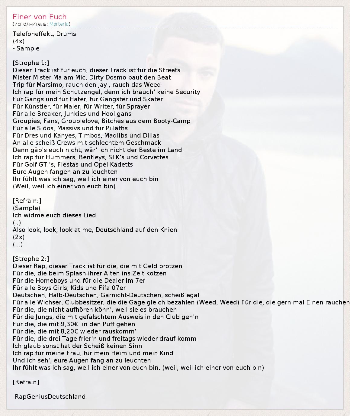 Telefoneffekt, Drums (4x) - Sample [Strophe 1:] Dieser Track ist für euch, dieser Track ist für die Streets Mister Mister Ma am Mic, Dirty Dosmo baut den Beat Trip für Marsimo, rauch den Jay , rauch das Weed Ich rap für mein Schutzengel, denn ich brauch' keine Security Für Gangs und für Hater, für Gangster und Skater Für Künstler, für Maler, für Writer, für Sprayer Für alle Breaker, Junkies und Hooligans Groupies, Fans, Groupielove, Bitches aus dem Booty-Camp Für alle Sidos, Massivs und für Pillaths Für Dres und Kanyes, Timbos, Madlibs und Dillas An alle scheiß Crews mit schlechtem Geschmack Denn gäb's euch nicht, wär' ich nicht der Beste im Land Ich rap für Hummers, Bentleys, SLK's und Corvettes Für Golf GTI's, Fiestas und Opel Kadetts Eure Augen fangen an zu leuchten Ihr fühlt was ich sag, weil ich einer von euch bin (Weil, weil ich einer von euch bin) [Refrain:] (Sample ) Ich widme euch dieses Lied (..) Also look, look, look at me, Deutschland auf den Knien (2x) (... ) [Strophe 2:] Dieser Rap, dieser Track ist für die, die mit Geld protzen Für die, die beim Splash ihrer Alten ins Zelt kotzen Für die Homeboys und für die Dealer im 7er Für alle Boys Girls, Kids und Fifa 07er Deutschen, Halb-Deutschen, Garnicht-Deutschen, scheiß egal Für alle Wichser, Clubbesitzer, die die Gage gleich bezahlen (Weed, Weed) Für die, die gern mal Einen rauchen Für die, die nicht aufhören könn', weil sie es brauchen Für die Jungs, die mit gefälschtem Ausweis in den Club geh'n Für die, die mit 9,30€ in den Puff gehen Für die, die mit 8,20€ wieder rauskomm' Für die, die drei Tage frier'n und freitags wieder drauf komm Ich glaub sonst hat der Scheiß keinen Sinn Ich rap für meine Frau, für mein Heim und mein Kind Und ich seh', eure Augen fang an zu leuchten Ihr fühlt was ich sag, weil ich einer von euch bin. (weil, weil ich einer von euch bin) [Refrain] -RapGeniusDeutschland