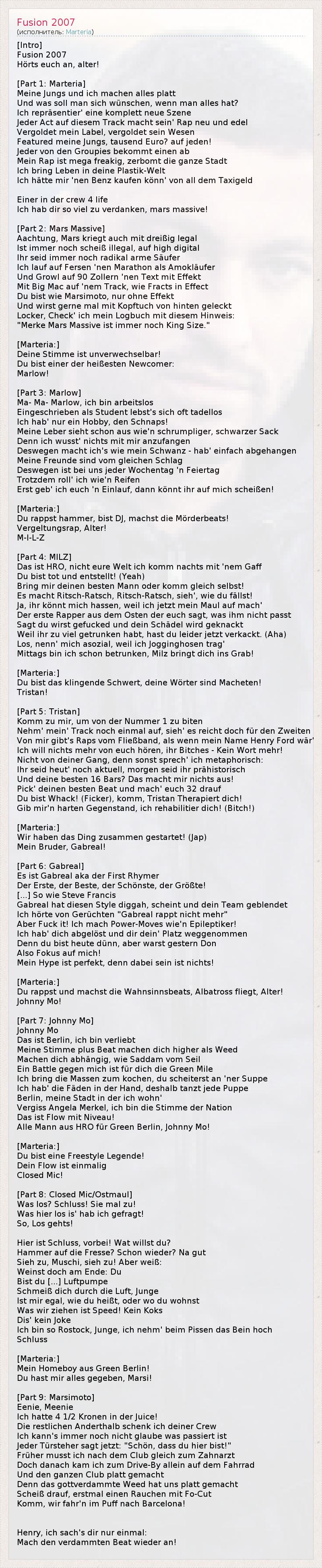 [Intro] Fusion 2007 Hörts euch an, alter! [Part 1: Marteria] Meine Jungs und ich machen alles platt Und was soll man sich wünschen, wenn man alles hat? Ich repräsentier' eine komplett neue Szene Jeder Act auf diesem Track macht sein' Rap neu und edel Vergoldet mein Label, vergoldet sein Wesen Featured meine Jungs, tausend Euro? auf jeden! Jeder von den Groupies bekommt einen ab Mein Rap ist mega freakig, zerbomt die ganze Stadt Ich bring Leben in deine Plastik-Welt Ich hätte mir 'nen Benz kaufen könn' von all dem Taxigeld Einer in der crew 4 life Ich hab dir so viel zu verdanken, mars massive! [Part 2: Mars Massive] Aachtung, Mars kriegt auch mit dreißig legal Ist immer noch scheiß illegal, auf high digital Ihr seid immer noch radikal arme Säufer Ich lauf auf Fersen 'nen Marathon als Amokläufer Und Growl auf 90 Zollern 'nen Text mit Effekt Mit Big Mac auf 'nem Track, wie Fracts in Effect Du bist wie Marsimoto, nur ohne Effekt Und wirst gerne mal mit Kopftuch von hinten geleckt Locker, Check' ich mein Logbuch mit diesem Hinweis: "Merke Mars Massive ist immer noch King Size." [Marteria:] Deine Stimme ist unverwechselbar! Du bist einer der heißesten Newcomer: Marlow! [Part 3: Marlow] Ma- Ma- Marlow, ich bin arbeitslos Eingeschrieben als Student lebst's sich oft tadellos Ich hab' nur ein Hobby, den Schnaps! Meine Leber sieht schon aus wie'n schrumpliger, schwarzer Sack Denn ich wusst' nichts mit mir anzufangen Deswegen macht ich's wie mein Schwanz - hab' einfach abgehangen Meine Freunde sind vom gleichen Schlag Deswegen ist bei uns jeder Wochentag 'n Feiertag Trotzdem roll' ich wie'n Reifen Erst geb' ich euch 'n Einlauf, dann könnt ihr auf mich scheißen! [Marteria:] Du rappst hammer, bist DJ, machst die Mörderbeats! Vergeltungsrap, Alter! M-I-L-Z [Part 4: MILZ] Das ist HRO, nicht eure Welt ich komm nachts mit 'nem Gaff Du bist tot und entstellt! (Yeah) Bring mir deinen besten Mann oder komm gleich selbst! Es macht Ritsch-Ratsch, Ritsch-Ratsch, sieh', wie du fällst! Ja, ihr könnt mich hassen, weil ich jetzt mein Maul auf mach' Der erste Rapper aus dem Osten der euch sagt, was ihm nicht passt Sagt du wirst gefucked und dein Schädel wird geknackt Weil ihr zu viel getrunken habt, hast du leider jetzt verkackt. (Aha) Los, nenn' mich asozial, weil ich Jogginghosen trag' Mittags bin ich schon betrunken, Milz bringt dich ins Grab! [Marteria:] Du bist das klingende Schwert, deine Wörter sind Macheten! Tristan! [Part 5: Tristan] Komm zu mir, um von der Nummer 1 zu biten Nehm' mein' Track noch einmal auf, sieh' es reicht doch für den Zweiten Von mir gibt's Raps vom Fließband, als wenn mein Name Henry Ford wär' Ich will nichts mehr von euch hören, ihr Bitches - Kein Wort mehr! Nicht von deiner Gang, denn sonst sprech' ich metaphorisch: Ihr seid heut' noch aktuell, morgen seid ihr prähistorisch Und deine besten 16 Bars? Das macht mir nichts aus! Pick' deinen besten Beat und mach' euch 32 drauf Du bist Whack! (Ficker), komm, Tristan Therapiert dich! Gib mir'n harten Gegenstand, ich rehabilitier dich! (Bitch!) [Marteria:] Wir haben das Ding zusammen gestartet! (Jap) Mein Bruder, Gabreal! [Part 6: Gabreal] Es ist Gabreal aka der First Rhymer Der Erste, der Beste, der Schönste, der Größte! [...] So wie Steve Francis Gabreal hat diesen Style diggah, scheint und dein Team geblendet Ich hörte von Gerüchten "Gabreal rappt nicht mehr" Aber Fuck it! Ich mach Power-Moves wie'n Epileptiker! Ich hab' dich abgelöst und dir dein' Platz weggenommen Denn du bist heute dünn, aber warst gestern Don Also Fokus auf mich! Mein Hype ist perfekt, denn dabei sein ist nichts! [Marteria:] Du rappst und machst die Wahnsinnsbeats, Albatross fliegt, Alter! Johnny Mo! [Part 7: Johnny Mo] Johnny Mo Das ist Berlin, ich bin verliebt Meine Stimme plus Beat machen dich higher als Weed Machen dich abhängig, wie Saddam vom Seil Ein Battle gegen mich ist für dich die Green Mile Ich bring die Massen zum kochen, du scheiterst an 'ner Suppe Ich hab' die Fäden in der Hand, deshalb tanzt jede Puppe Berlin, meine Stadt in der ich wohn' Vergiss Angela Merkel, ich bin die Stimme der Nation Das ist Flow mit Niveau! Alle Mann aus HRO für Green Berlin, Johnny Mo! [Marteria:] Du bist eine Freestyle Legende! Dein Flow ist einmalig Closed Mic! [Part 8: Closed Mic/Ostmaul] Was los? Schluss! Sie mal zu! Was hier los is' hab ich gefragt! So, Los gehts! Hier ist Schluss, vorbei! Wat willst du? Hammer auf die Fresse? Schon wieder? Na gut Sieh zu, Muschi, sieh zu! Aber weiß: Weinst doch am Ende: Du Bist du [...] Luftpumpe Schmeiß dich durch die Luft, Junge Ist mir egal, wie du heißt, oder wo du wohnst Was wir ziehen ist Speed! Kein Koks Dis' kein Joke Ich bin so Rostock, Junge, ich nehm' beim Pissen das Bein hoch Schluss [Marteria:] Mein Homeboy aus Green Berlin! Du hast mir alles gegeben, Marsi! [Part 9: Marsimoto] Eenie, Meenie Ich hatte 4 1/2 Kronen in der Juice! Die restlichen Anderthalb schenk ich deiner Crew Ich kann's immer noch nicht glaube was passiert ist Jeder Türsteher sagt jetzt: "Schön, dass du hier bist!" Früher musst ich nach dem Club gleich zum Zahnarzt Doch danach kam ich zum Drive-By allein auf dem Fahrrad Und den ganzen Club platt gemacht Denn das gottverdammte Weed hat uns platt gemacht Scheiß drauf, erstmal einen Rauchen mit Fo-Cut Komm, wir fahr'n im Puff nach Barcelona! Henry, ich sach's dir nur einmal: Mach den verdammten Beat wieder an!