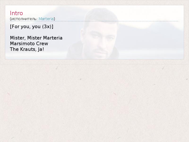 Это интересно:Marteria это псевдоним Мартена Ласини (Marten Laciny). Xип-хоп - это его уже четвертая успешная карьера. Мартен родился 4 декабря 1982 года на севере Германии в Ростоке. В детстве играл в футбол, причем настолько хорошо, что мог стать профессионалом. Но от карьеры футболиста он отказался и стал фотомоделью. Юноша жил в Нью-Йорке и фотографировался для таких марок как Hugo Boss и Diesel. В 2002 году он... продолжение