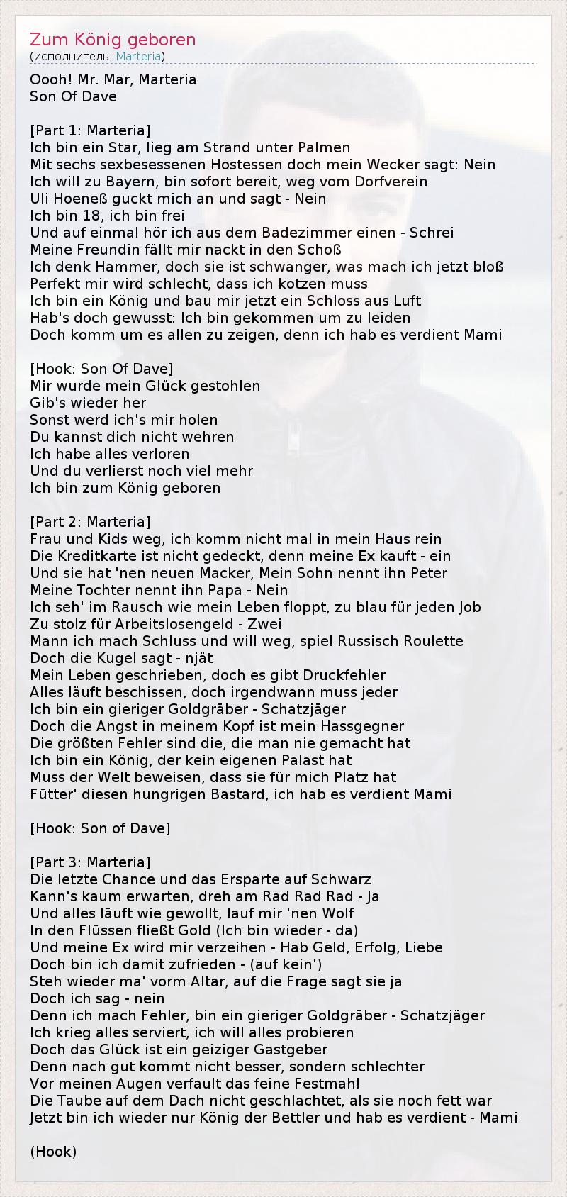Это интересно:Marteria это псевдоним Мартена Ласини (Marten Laciny). Xип-хоп - это его уже четвертая успешная карьера. Мартен родился 4 декабря 1982 года на севере Германии в Ростоке. В детстве играл в футбол, причем настолько хорошо, что мог стать профессионалом. Но от карьеры футболиста он отказался и стал фотомоделью. Юноша жил в Нью-Йорке и фотографировался для таких марок как Hugo Boss и Diesel. В 2002 году он... продолжение