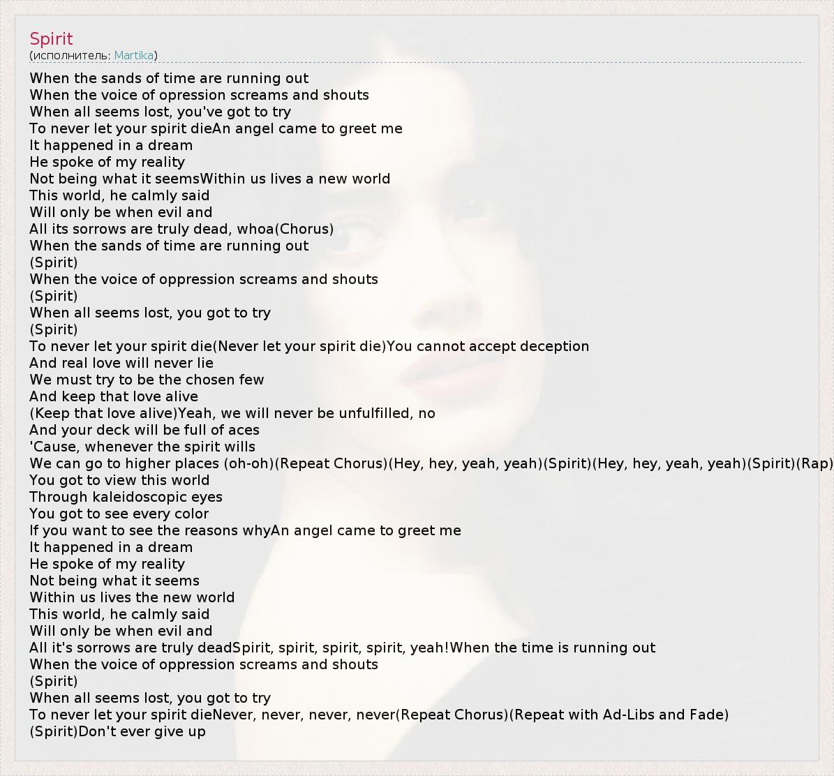 To never let your spirit dieNever, never, never, never(Repeat Chorus)(Repeat with Ad-Libs and Fade)