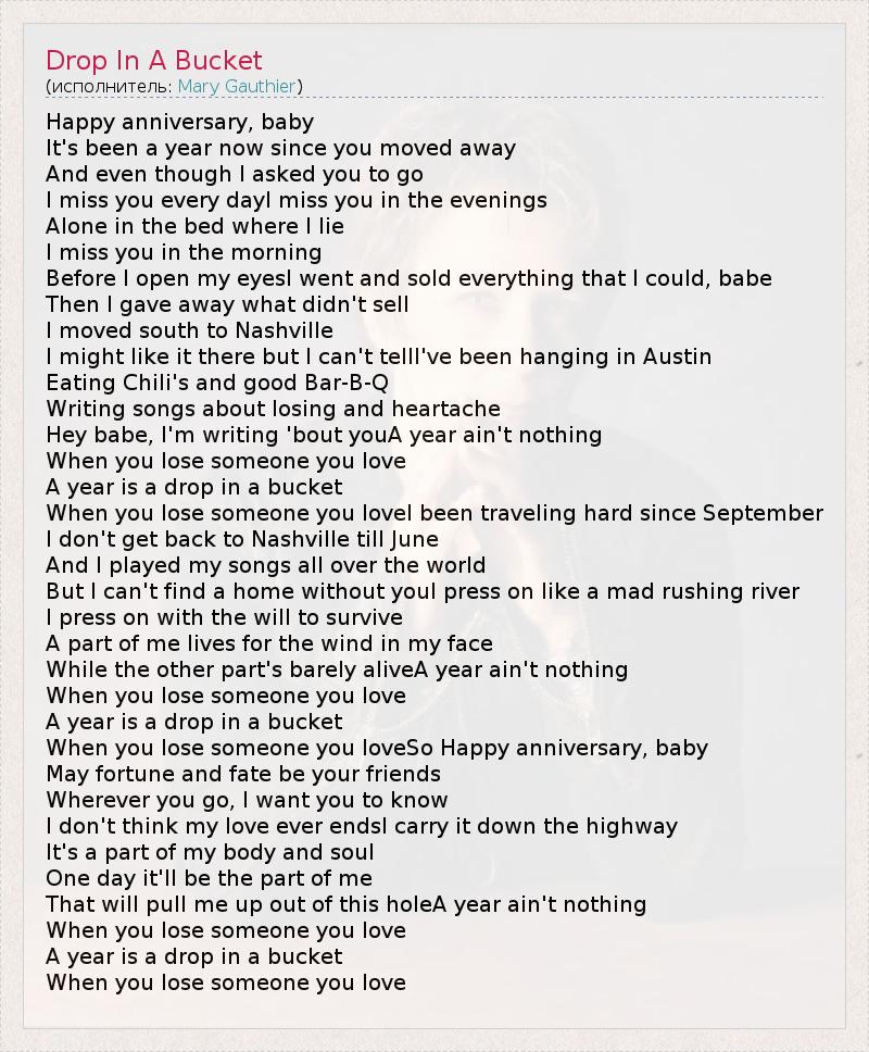 Happy anniversary, baby It's been a year now since you moved away And even though I asked you to go I miss you every dayI miss you in the evenings Alone in the bed where I lie I miss you in the morning Before I open my eyesI went and sold everything that I could, babe Then I gave away what didn't sell I moved south to Nashville I might like it there but I can't tellI've been hanging in Austin Eating Chili's and good Bar-B-Q Writing songs about losing and heartache Hey babe, I'm writing 'bout youA year ain't nothing When you lose someone you love A year is a drop in a bucket When you lose someone you loveI been traveling hard since September I don't get back to Nashville till June And I played my songs all over the world But I can't find a home without youI press on like a mad rushing river I press on with the will to survive A part of me lives for the wind in my face While the other part's barely aliveA year ain't nothing When you lose someone you love A year is a drop in a bucket When you lose someone you loveSo Happy anniversary, baby May fortune and fate be your friends Wherever you go, I want you to know I don't think my love ever endsI carry it down the highway It's a part of my body and soul One day it'll be the part of me That will pull me up out of this holeA year ain't nothing When you lose someone you love A year is a drop in a bucket When you lose someone you love