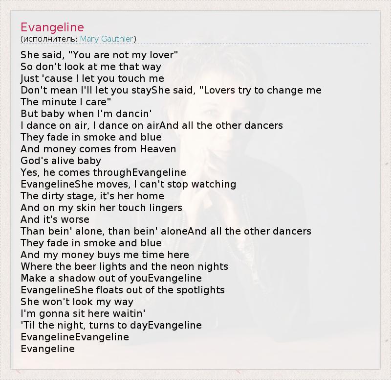 She said, "You are not my lover" So don't look at me that way Just 'cause I let you touch me Don't mean I'll let you stayShe said, "Lovers try to change me The minute I care" But baby when I'm dancin' I dance on air, I dance on airAnd all the other dancers They fade in smoke and blue And money comes from Heaven God's alive baby Yes, he comes throughEvangeline EvangelineShe moves, I can't stop watching The dirty stage, it's her home And on my skin her touch lingers And it's worse Than bein' alone, than bein' aloneAnd all the other dancers They fade in smoke and blue And my money buys me time here Where the beer lights and the neon nights Make a shadow out of youEvangeline EvangelineShe floats out of the spotlights She won't look my way I'm gonna sit here waitin' 'Til the night, turns to dayEvangeline EvangelineEvangeline Evangeline