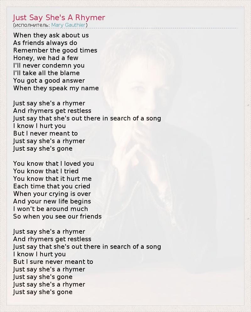 When they ask about us As friends always do Remember the good times Honey, we had a few I'll never condemn you I'll take all the blame You got a good answer When they speak my name Just say she's a rhymer And rhymers get restless Just say that she's out there in search of a song I know I hurt you But I never meant to Just say she's a rhymer Just say she's gone You know that I loved you You know that I tried You know that it hurt me Each time that you cried When your crying is over And your new life begins I won't be around much So when you see our friends Just say she's a rhymer And rhymers get restless Just say that she's out there in search of a song I know I hurt you But I sure never meant to Just say she's a rhymer Just say she's gone Just say she's a rhymer Just say she's gone