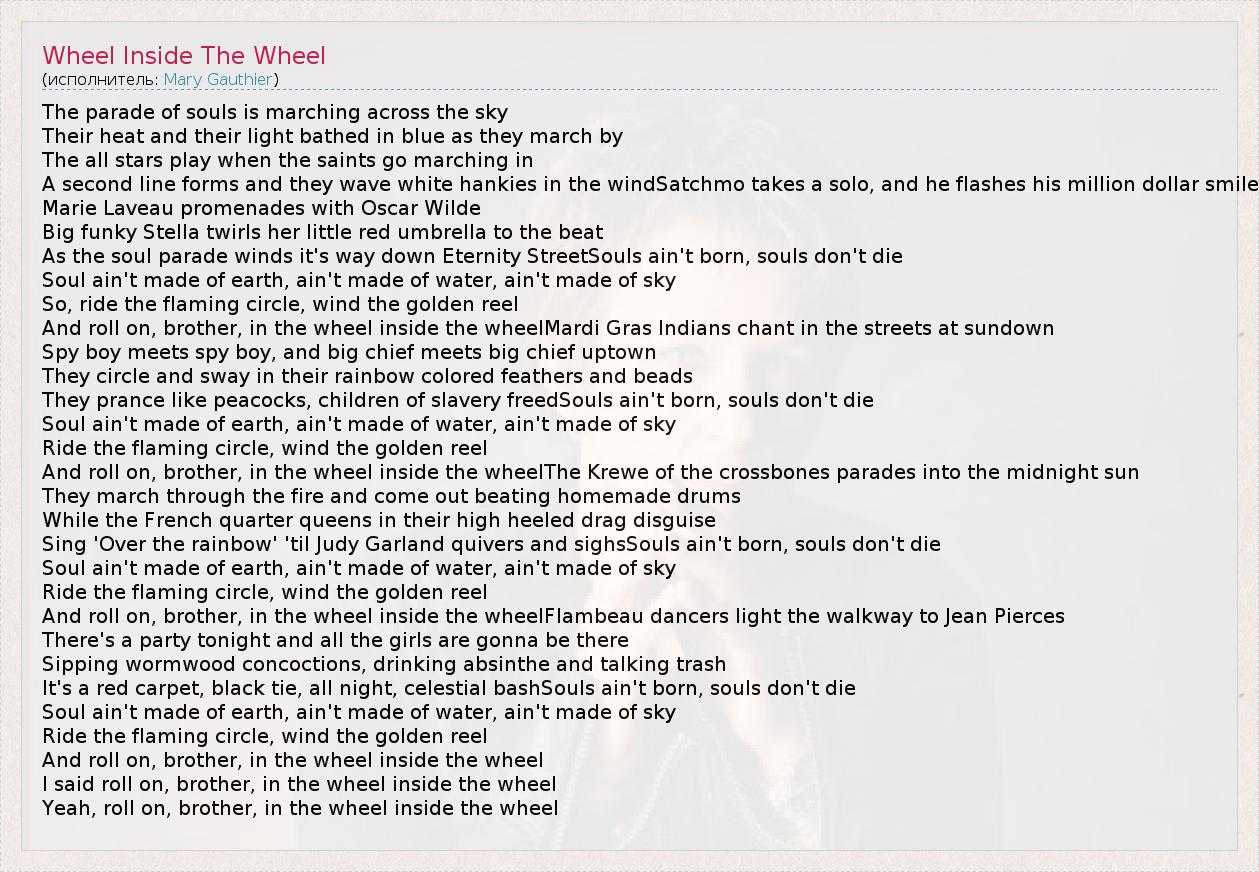The parade of souls is marching across the sky Their heat and their light bathed in blue as they march by The all stars play when the saints go marching in A second line forms and they wave white hankies in the windSatchmo takes a solo, and he flashes his million dollar smile Marie Laveau promenades with Oscar Wilde Big funky Stella twirls her little red umbrella to the beat As the soul parade winds it's way down Eternity StreetSouls ain't born, souls don't die Soul ain't made of earth, ain't made of water, ain't made of sky So, ride the flaming circle, wind the golden reel And roll on, brother, in the wheel inside the wheelMardi Gras Indians chant in the streets at sundown Spy boy meets spy boy, and big chief meets big chief uptown They circle and sway in their rainbow colored feathers and beads They prance like peacocks, children of slavery freedSouls ain't born, souls don't die Soul ain't made of earth, ain't made of water, ain't made of sky Ride the flaming circle, wind the golden reel And roll on, brother, in the wheel inside the wheelThe Krewe of the crossbones parades into the midnight sun They march through the fire and come out beating homemade drums While the French quarter queens in their high heeled drag disguise Sing 'Over the rainbow' 'til Judy Garland quivers and sighsSouls ain't born, souls don't die Soul ain't made of earth, ain't made of water, ain't made of sky Ride the flaming circle, wind the golden reel And roll on, brother, in the wheel inside the wheelFlambeau dancers light the walkway to Jean Pierces There's a party tonight and all the girls are gonna be there Sipping wormwood concoctions, drinking absinthe and talking trash It's a red carpet, black tie, all night, celestial bashSouls ain't born, souls don't die Soul ain't made of earth, ain't made of water, ain't made of sky Ride the flaming circle, wind the golden reel And roll on, brother, in the wheel inside the wheel I said roll on, brother, in the wheel inside the wheel Yeah, roll on, brother, in the wheel inside the wheel