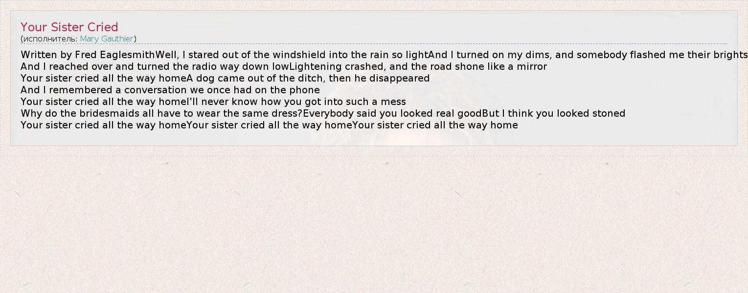 Written by Fred EaglesmithWell, I stared out of the windshield into the rain so lightAnd I turned on my dims, and somebody flashed me their brights And I reached over and turned the radio way down lowLightening crashed, and the road shone like a mirror Your sister cried all the way homeA dog came out of the ditch, then he disappeared And I remembered a conversation we once had on the phone Your sister cried all the way homeI'll never know how you got into such a mess Why do the bridesmaids all have to wear the same dress?Everybody said you looked real goodBut I think you looked stoned Your sister cried all the way homeYour sister cried all the way homeYour sister cried all the way home
