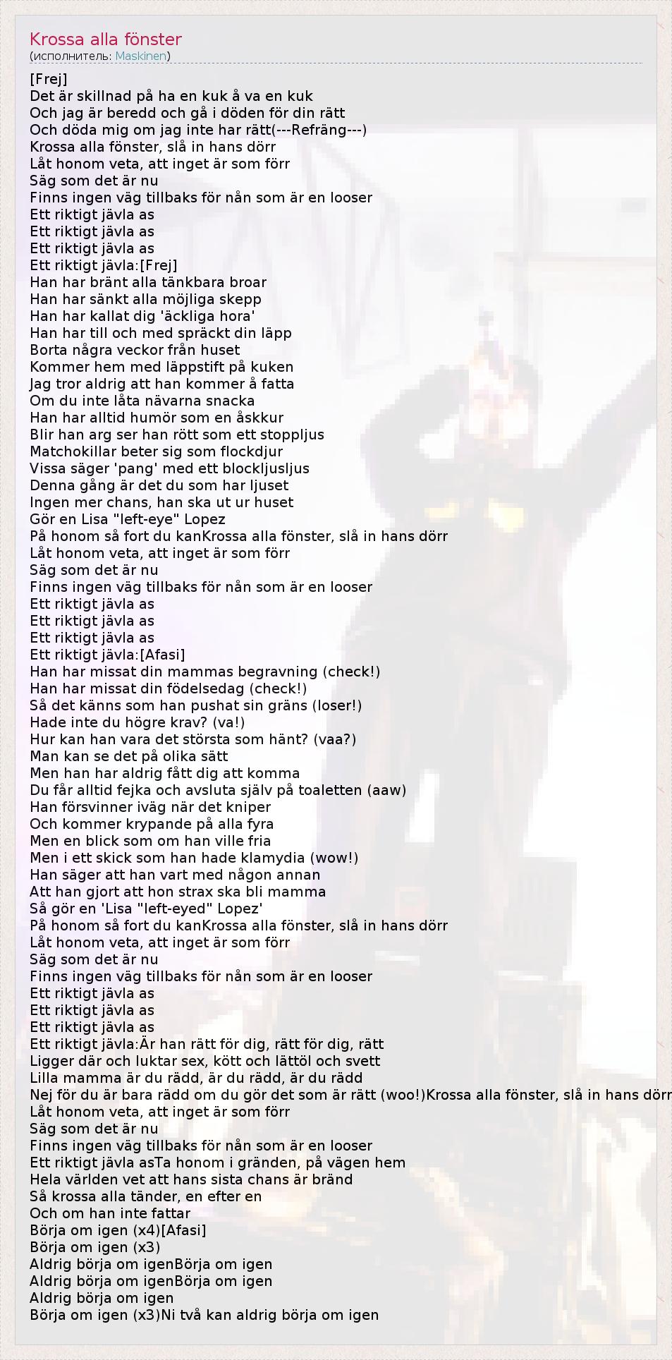 [Frej] Det är skillnad på ha en kuk å va en kuk Och jag är beredd och gå i döden för din rätt Och döda mig om jag inte har rätt(---Refräng---) Krossa alla fönster, slå in hans dörr Låt honom veta, att inget är som förr Säg som det är nu Finns ingen väg tillbaks för nån som är en looser Ett riktigt jävla as Ett riktigt jävla as Ett riktigt jävla as Ett riktigt jävla:[Frej] Han har bränt alla tänkbara broar Han har sänkt alla möjliga skepp Han har kallat dig 'äckliga hora' Han har till och med spräckt din läpp Borta några veckor från huset Kommer hem med läppstift på kuken Jag tror aldrig att han kommer å fatta Om du inte låta nävarna snacka Han har alltid humör som en åskkur Blir han arg ser han rött som ett stoppljus Matchokillar beter sig som flockdjur Vissa säger 'pang' med ett blockljusljus Denna gång är det du som har ljuset Ingen mer chans, han ska ut ur huset Gör en Lisa "left-eye" Lopez På honom så fort du kanKrossa alla fönster, slå in hans dörr Låt honom veta, att inget är som förr Säg som det är nu Finns ingen väg tillbaks för nån som är en looser Ett riktigt jävla as Ett riktigt jävla as Ett riktigt jävla as Ett riktigt jävla:[Afasi] Han har missat din mammas begravning (check!) Han har missat din födelsedag (check!) Så det känns som han pushat sin gräns (loser!) Hade inte du högre krav? (va!) Hur kan han vara det största som hänt? (vaa?) Man kan se det på olika sätt Men han har aldrig fått dig att komma Du får alltid fejka och avsluta själv på toaletten (aaw) Han försvinner iväg när det kniper Och kommer krypande på alla fyra Men en blick som om han ville fria Men i ett skick som han hade klamydia (wow!) Han säger att han vart med någon annan Att han gjort att hon strax ska bli mamma Så gör en 'Lisa "left-eyed" Lopez' På honom så fort du kanKrossa alla fönster, slå in hans dörr Låt honom veta, att inget är som förr Säg som det är nu Finns ingen väg tillbaks för nån som är en looser Ett riktigt jävla as Ett riktigt jävla as Ett riktigt jävla as Ett riktigt jävla:Är han rätt för dig, rätt för dig, rätt Ligger där och luktar sex, kött och lättöl och svett Lilla mamma är du rädd, är du rädd, är du rädd Nej för du är bara rädd om du gör det som är rätt (woo!)Krossa alla fönster, slå in hans dörr Låt honom veta, att inget är som förr Säg som det är nu Finns ingen väg tillbaks för nån som är en looser Ett riktigt jävla asTa honom i gränden, på vägen hem Hela världen vet att hans sista chans är bränd Så krossa alla tänder, en efter en Och om han inte fattar Börja om igen (x4)[Afasi] Börja om igen (x3) Aldrig börja om igenBörja om igen Aldrig börja om igenBörja om igen Aldrig börja om igen Börja om igen (x3)Ni två kan aldrig börja om igen