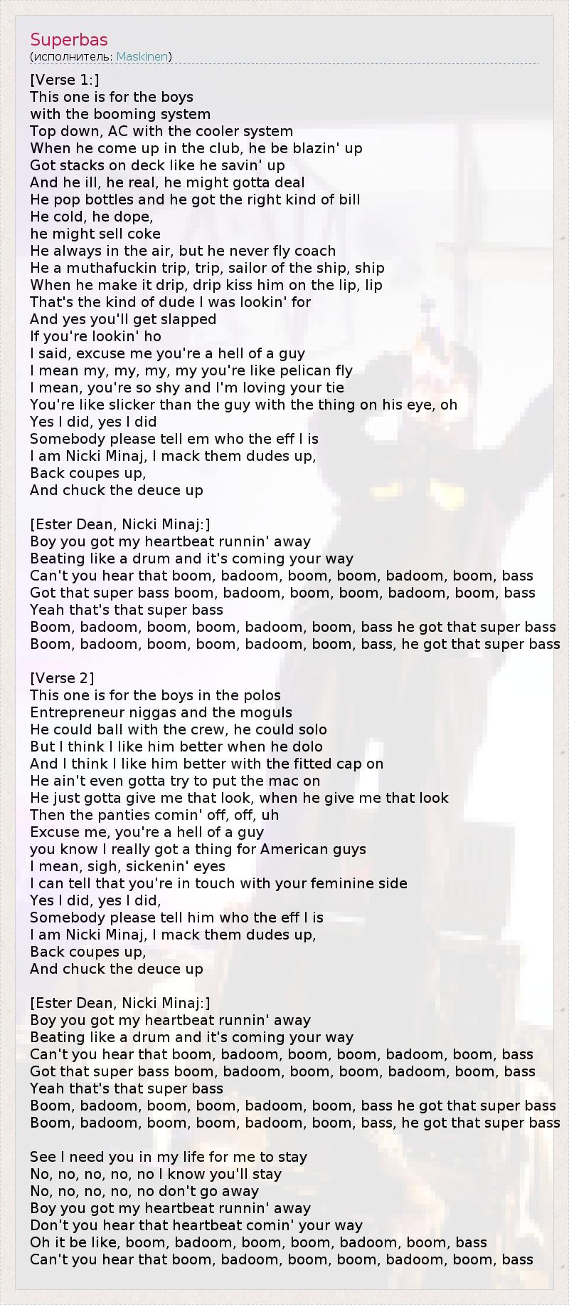 [Verse 1:] This one is for the boys with the booming system Top down, AC with the cooler system When he come up in the club, he be blazin' up Got stacks on deck like he savin' up And he ill, he real, he might gotta deal He pop bottles and he got the right kind of bill He cold, he dope, he might sell coke He always in the air, but he never fly coach He a muthafuckin trip, trip, sailor of the ship, ship When he make it drip, drip kiss him on the lip, lip That's the kind of dude I was lookin' for And yes you'll get slapped If you're lookin' ho I said, excuse me you're a hell of a guy I mean my, my, my, my you're like pelican fly I mean, you're so shy and I'm loving your tie You're like slicker than the guy with the thing on his eye, oh Yes I did, yes I did Somebody please tell em who the eff I is I am Nicki Minaj, I mack them dudes up, Back coupes up, And chuck the deuce up [Ester Dean, Nicki Minaj:] Boy you got my heartbeat runnin' away Beating like a drum and it's coming your way Can't you hear that boom, badoom, boom, boom, badoom, boom, bass Got that super bass boom, badoom, boom, boom, badoom, boom, bass Yeah that's that super bass Boom, badoom, boom, boom, badoom, boom, bass he got that super bass Boom, badoom, boom, boom, badoom, boom, bass, he got that super bass [Verse 2] This one is for the boys in the polos Entrepreneur niggas and the moguls He could ball with the crew, he could solo But I think I like him better when he dolo And I think I like him better with the fitted cap on He ain't even gotta try to put the mac on He just gotta give me that look, when he give me that look Then the panties comin' off, off, uh Excuse me, you're a hell of a guy you know I really got a thing for American guys I mean, sigh, sickenin' eyes I can tell that you're in touch with your feminine side Yes I did, yes I did, Somebody please tell him who the eff I is I am Nicki Minaj, I mack them dudes up, Back coupes up, And chuck the deuce up [Ester Dean, Nicki Minaj:] Boy you got my heartbeat runnin' away Beating like a drum and it's coming your way Can't you hear that boom, badoom, boom, boom, badoom, boom, bass Got that super bass boom, badoom, boom, boom, badoom, boom, bass Yeah that's that super bass Boom, badoom, boom, boom, badoom, boom, bass he got that super bass Boom, badoom, boom, boom, badoom, boom, bass, he got that super bass See I need you in my life for me to stay No, no, no, no, no I know you'll stay No, no, no, no, no don't go away Boy you got my heartbeat runnin' away Don't you hear that heartbeat comin' your way Oh it be like, boom, badoom, boom, boom, badoom, boom, bass Can't you hear that boom, badoom, boom, boom, badoom, boom, bass