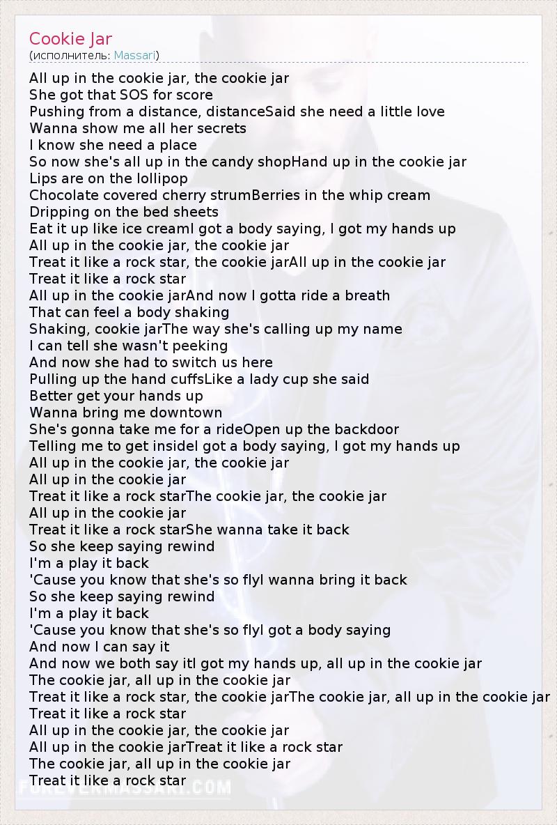 All up in the cookie jar, the cookie jar She got that SOS for score Pushing from a distance, distanceSaid she need a little love Wanna show me all her secrets I know she need a place So now she's all up in the candy shopHand up in the cookie jar Lips are on the lollipop Chocolate covered cherry strumBerries in the whip cream Dripping on the bed sheets Eat it up like ice creamI got a body saying, I got my hands up All up in the cookie jar, the cookie jar Treat it like a rock star, the cookie jarAll up in the cookie jar Treat it like a rock star All up in the cookie jarAnd now I gotta ride a breath That can feel a body shaking Shaking, cookie jarThe way she's calling up my name I can tell she wasn't peeking And now she had to switch us here Pulling up the hand cuffsLike a lady cup she said Better get your hands up Wanna bring me downtown She's gonna take me for a rideOpen up the backdoor Telling me to get insideI got a body saying, I got my hands up All up in the cookie jar, the cookie jar All up in the cookie jar Treat it like a rock starThe cookie jar, the cookie jar All up in the cookie jar Treat it like a rock starShe wanna take it back So she keep saying rewind I'm a play it back 'Cause you know that she's so flyI wanna bring it back So she keep saying rewind I'm a play it back 'Cause you know that she's so flyI got a body saying And now I can say it And now we both say itI got my hands up, all up in the cookie jar The cookie jar, all up in the cookie jar Treat it like a rock star, the cookie jarThe cookie jar, all up in the cookie jar Treat it like a rock star All up in the cookie jar, the cookie jar All up in the cookie jarTreat it like a rock star The cookie jar, all up in the cookie jar Treat it like a rock star