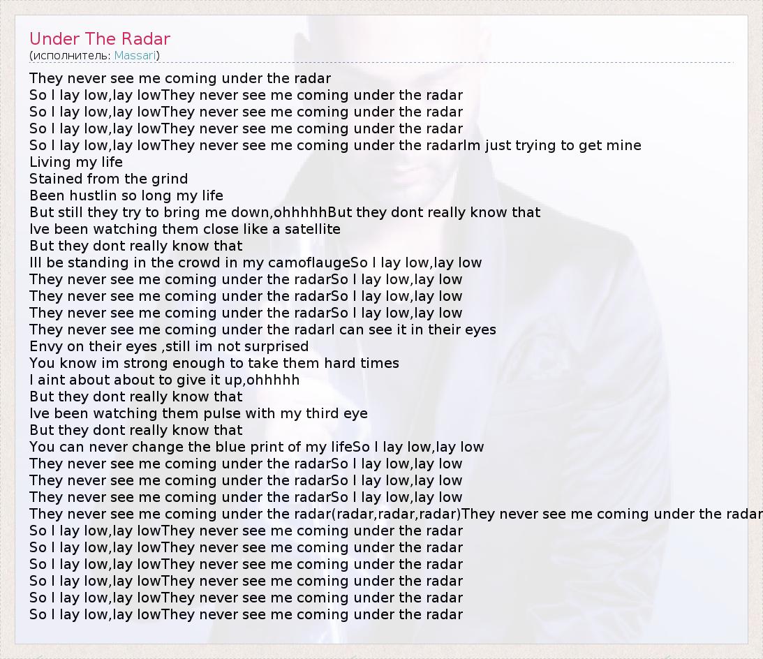 They never see me coming under the radar So I lay low,lay lowThey never see me coming under the radar So I lay low,lay lowThey never see me coming under the radar So I lay low,lay lowThey never see me coming under the radar So I lay low,lay lowThey never see me coming under the radarIm just trying to get mine Living my life Stained from the grind Been hustlin so long my life But still they try to bring me down,ohhhhhBut they dont really know that Ive been watching them close like a satellite But they dont really know that Ill be standing in the crowd in my camoflaugeSo I lay low,lay low They never see me coming under the radarSo I lay low,lay low They never see me coming under the radarSo I lay low,lay low They never see me coming under the radarSo I lay low,lay low They never see me coming under the radarI can see it in their eyes Envy on their eyes ,still im not surprised You know im strong enough to take them hard times I aint about about to give it up,ohhhhh But they dont really know that Ive been watching them pulse with my third eye But they dont really know that You can never change the blue print of my lifeSo I lay low,lay low They never see me coming under the radarSo I lay low,lay low They never see me coming under the radarSo I lay low,lay low They never see me coming under the radarSo I lay low,lay low They never see me coming under the radar(radar,radar,radar)They never see me coming under the radar So I lay low,lay lowThey never see me coming under the radar So I lay low,lay lowThey never see me coming under the radar So I lay low,lay lowThey never see me coming under the radar So I lay low,lay lowThey never see me coming under the radar So I lay low,lay lowThey never see me coming under the radar So I lay low,lay lowThey never see me coming under the radar
