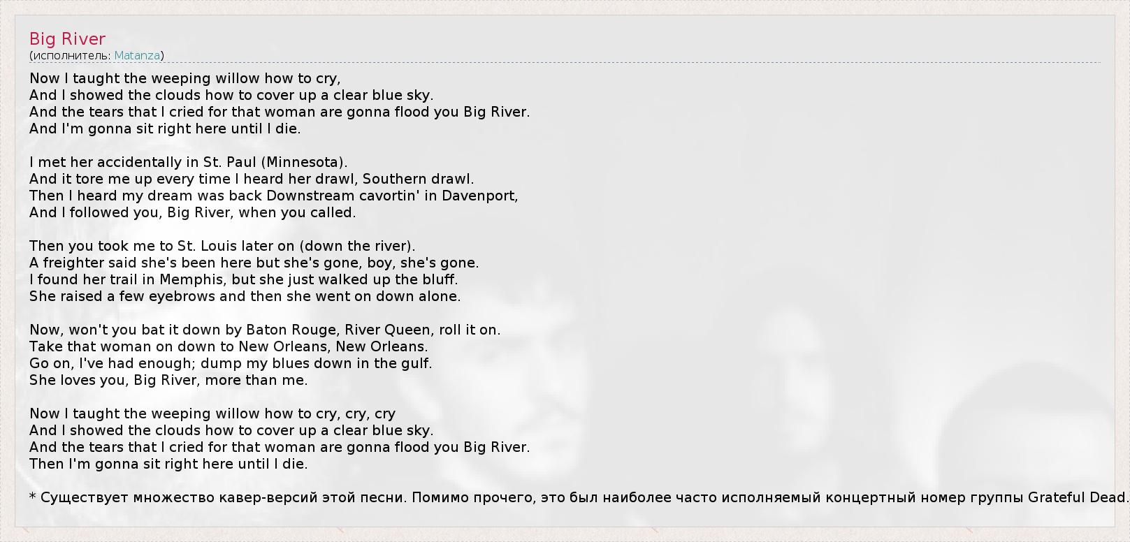 Now I taught the weeping willow how to cry, And I showed the clouds how to cover up a clear blue sky. And the tears that I cried for that woman are gonna flood you Big River. And I'm gonna sit right here until I die. I met her accidentally in St. Paul (Minnesota). And it tore me up every time I heard her drawl, Southern drawl. Then I heard my dream was back Downstream cavortin' in Davenport, And I followed you, Big River, when you called. Then you took me to St. Louis later on (down the river). A freighter said she's been here but she's gone, boy, she's gone. I found her trail in Memphis, but she just walked up the bluff. She raised a few eyebrows and then she went on down alone. Now, won't you bat it down by Baton Rouge, River Queen, roll it on. Take that woman on down to New Orleans, New Orleans. Go on, I've had enough; dump my blues down in the gulf. She loves you, Big River, more than me. Now I taught the weeping willow how to cry, cry, cry And I showed the clouds how to cover up a clear blue sky. And the tears that I cried for that woman are gonna flood you Big River. Then I'm gonna sit right here until I die. * Существует множество кавер-версий этой песни. Помимо прочего, это был наиболее часто исполняемый концертный номер группы Grateful Dead.
