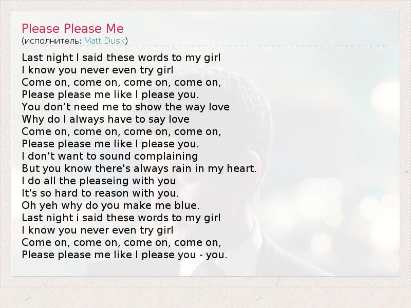 Last night I said these words to my girl I know you never even try girl Come on, come on, come on, come on, Please please me like I please you. You don't need me to show the way love Why do I always have to say love Come on, come on, come on, come on, Please please me like I please you. I don't want to sound complaining But you know there's always rain in my heart. I do all the pleaseing with you It's so hard to reason with you. Oh yeh why do you make me blue. Last night i said these words to my girl I know you never even try girl Come on, come on, come on, come on, Please please me like I please you - you.
