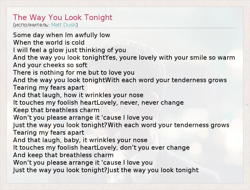 Some day when Im awfully low When the world is cold I will feel a glow just thinking of you And the way you look tonightYes, youre lovely with your smile so warm And your cheeks so soft There is nothing for me but to love you And the way you look tonightWith each word your tenderness grows Tearing my fears apart And that laugh, how it wrinkles your nose It touches my foolish heartLovely, never, never change Keep that breathless charm Won't you please arrange it 'cause I love you Just the way you look tonight?With each word your tenderness grows Tearing my fears apart And that laugh, baby, it wrinkles your nose It touches my foolish heartLovely, don't you ever change And keep that breathless charm Won't you please arrange it 'cause I love you Just the way you look tonight?Just the way you look tonight