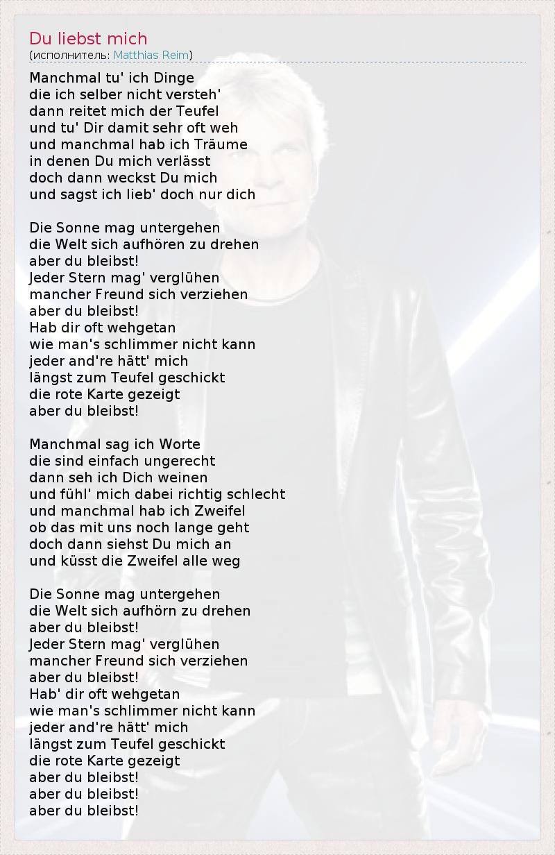 Это интересно:Маттиас Райм (род. 26 ноября 1957 г.) - один из самых популярных певцов Германии. Родился в Северно-гессенском городе Корбах, вырос в районном центре Homberg (Efze). Отец был директором гимназии в Корбахe. Его первым — и самым большим хитом стала песня "Verdammt, ich lieb' Dich" 1990 года. Сингл был продан во всем мире тиражом 2,5 млн. и находился целых 16 недель — с 18 мая по 6 сентября — на первом месте немецких... продолжение