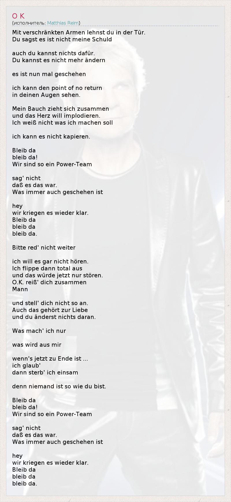 Это интересно:Маттиас Райм (род. 26 ноября 1957 г.) - один из самых популярных певцов Германии. Родился в Северно-гессенском городе Корбах, вырос в районном центре Homberg (Efze). Отец был директором гимназии в Корбахe. Его первым — и самым большим хитом стала песня "Verdammt, ich lieb' Dich" 1990 года. Сингл был продан во всем мире тиражом 2,5 млн. и находился целых 16 недель — с 18 мая по 6 сентября — на первом месте немецких... продолжение