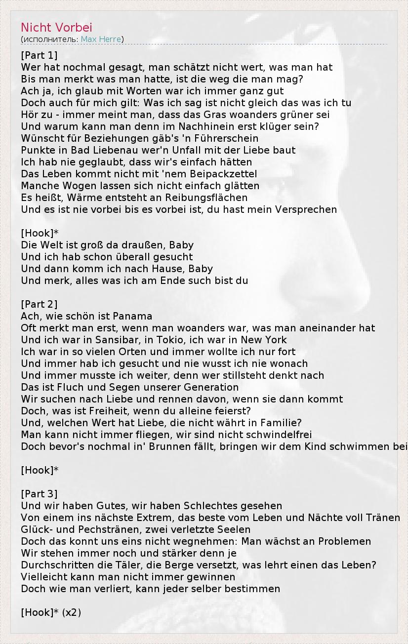 [Part 1] Wer hat nochmal gesagt, man schätzt nicht wert, was man hat Bis man merkt was man hatte, ist die weg die man mag? Ach ja, ich glaub mit Worten war ich immer ganz gut Doch auch für mich gilt: Was ich sag ist nicht gleich das was ich tu Hör zu - immer meint man, dass das Gras woanders grüner sei Und warum kann man denn im Nachhinein erst klüger sein? Wünscht für Beziehungen gäb's 'n Führerschein Punkte in Bad Liebenau wer'n Unfall mit der Liebe baut Ich hab nie geglaubt, dass wir's einfach hätten Das Leben kommt nicht mit 'nem Beipackzettel Manche Wogen lassen sich nicht einfach glätten Es heißt, Wärme entsteht an Reibungsflächen Und es ist nie vorbei bis es vorbei ist, du hast mein Versprechen [Hook]* Die Welt ist groß da draußen, Baby Und ich hab schon überall gesucht Und dann komm ich nach Hause, Baby Und merk, alles was ich am Ende such bist du [Part 2] Ach, wie schön ist Panama Oft merkt man erst, wenn man woanders war, was man aneinander hat Und ich war in Sansibar, in Tokio, ich war in New York Ich war in so vielen Orten und immer wollte ich nur fort Und immer hab ich gesucht und nie wusst ich nie wonach Und immer musste ich weiter, denn wer stillsteht denkt nach Das ist Fluch und Segen unserer Generation Wir suchen nach Liebe und rennen davon, wenn sie dann kommt Doch, was ist Freiheit, wenn du alleine feierst? Und, welchen Wert hat Liebe, die nicht währt in Familie? Man kann nicht immer fliegen, wir sind nicht schwindelfrei Doch bevor's nochmal in' Brunnen fällt, bringen wir dem Kind schwimmen bei [Hook]* [Part 3] Und wir haben Gutes, wir haben Schlechtes gesehen Von einem ins nächste Extrem, das beste vom Leben und Nächte voll Tränen Glück- und Pechstränen, zwei verletzte Seelen Doch das konnt uns eins nicht wegnehmen: Man wächst an Problemen Wir stehen immer noch und stärker denn je Durchschritten die Täler, die Berge versetzt, was lehrt einen das Leben? Vielleicht kann man nicht immer gewinnen Doch wie man verliert, kann jeder selber bestimmen [Hook]* (x2)