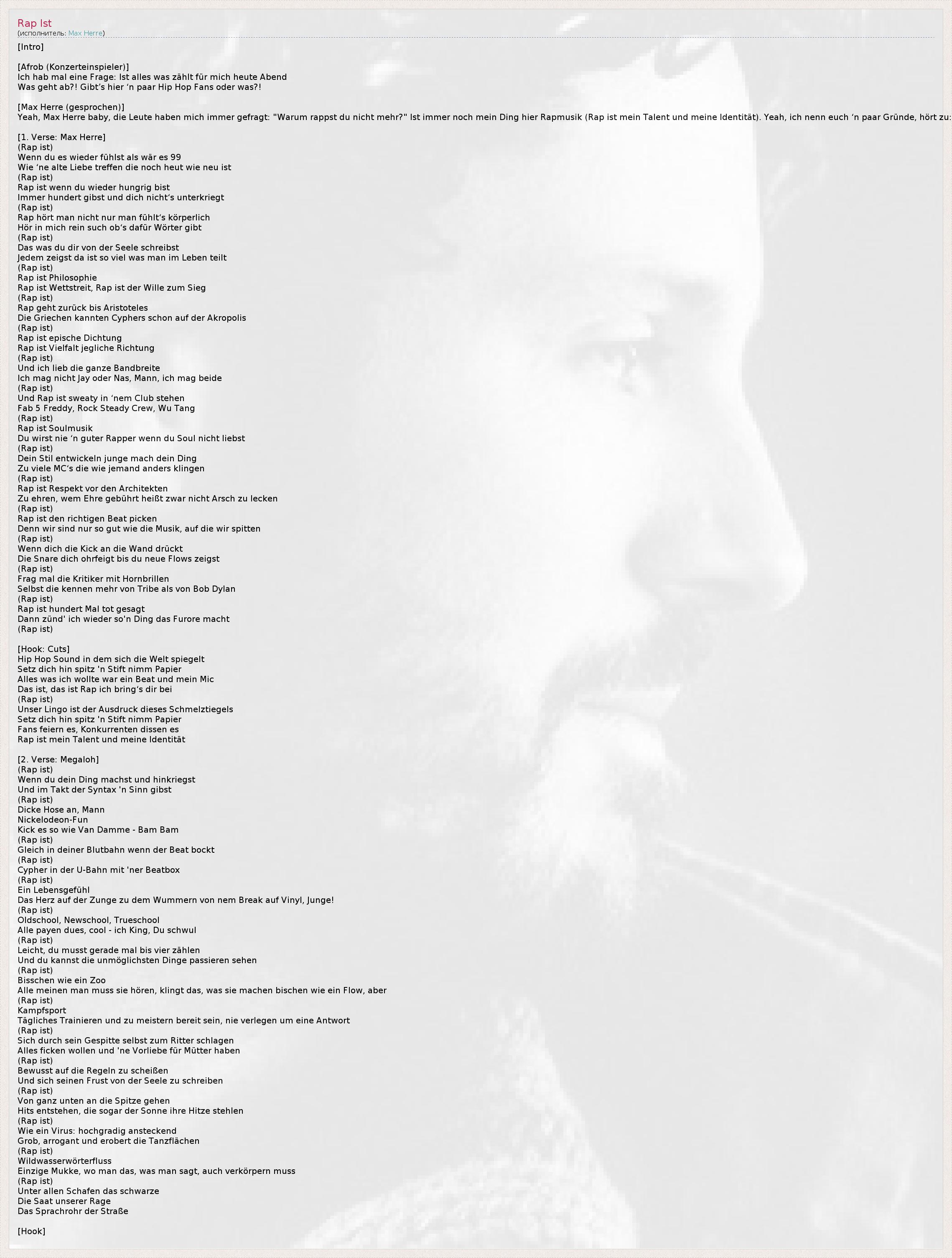 [Intro] [Afrob (Konzerteinspieler)] Ich hab mal eine Frage: Ist alles was zählt für mich heute Abend Was geht ab?! Gibt’s hier ‘n paar Hip Hop Fans oder was?! [Max Herre (gesprochen)] Yeah, Max Herre baby, die Leute haben mich immer gefragt: "Warum rappst du nicht mehr?" Ist immer noch mein Ding hier Rapmusik (Rap ist mein Talent und meine Identität). Yeah, ich nenn euch ‘n paar Gründe, hört zu: [1. Verse: Max Herre] (Rap ist) Wenn du es wieder fühlst als wär es 99 Wie ‘ne alte Liebe treffen die noch heut wie neu ist (Rap ist) Rap ist wenn du wieder hungrig bist Immer hundert gibst und dich nicht‘s unterkriegt (Rap ist) Rap hört man nicht nur man fühlt‘s körperlich Hör in mich rein such ob‘s dafür Wörter gibt (Rap ist) Das was du dir von der Seele schreibst Jedem zeigst da ist so viel was man im Leben teilt (Rap ist) Rap ist Philosophie Rap ist Wettstreit, Rap ist der Wille zum Sieg (Rap ist) Rap geht zurück bis Aristoteles Die Griechen kannten Cyphers schon auf der Akropolis (Rap ist) Rap ist epische Dichtung Rap ist Vielfalt jegliche Richtung (Rap ist) Und ich lieb die ganze Bandbreite Ich mag nicht Jay oder Nas, Mann, ich mag beide (Rap ist) Und Rap ist sweaty in ‘nem Club stehen Fab 5 Freddy, Rock Steady Crew, Wu Tang (Rap ist) Rap ist Soulmusik Du wirst nie ‘n guter Rapper wenn du Soul nicht liebst (Rap ist) Dein Stil entwickeln junge mach dein Ding Zu viele MC‘s die wie jemand anders klingen (Rap ist) Rap ist Respekt vor den Architekten Zu ehren, wem Ehre gebührt heißt zwar nicht Arsch zu lecken (Rap ist) Rap ist den richtigen Beat picken Denn wir sind nur so gut wie die Musik, auf die wir spitten (Rap ist) Wenn dich die Kick an die Wand drückt Die Snare dich ohrfeigt bis du neue Flows zeigst (Rap ist) Frag mal die Kritiker mit Hornbrillen Selbst die kennen mehr von Tribe als von Bob Dylan (Rap ist) Rap ist hundert Mal tot gesagt Dann zünd' ich wieder so'n Ding das Furore macht (Rap ist) [Hook: Cuts] Hip Hop Sound in dem sich die Welt spiegelt Setz dich hin spitz 'n Stift nimm Papier Alles was ich wollte war ein Beat und mein Mic Das ist, das ist Rap ich bring‘s dir bei (Rap ist) Unser Lingo ist der Ausdruck dieses Schmelztiegels Setz dich hin spitz 'n Stift nimm Papier Fans feiern es, Konkurrenten dissen es Rap ist mein Talent und meine Identität [2. Verse: Megaloh] (Rap ist) Wenn du dein Ding machst und hinkriegst Und im Takt der Syntax 'n Sinn gibst (Rap ist) Dicke Hose an, Mann Nickelodeon-Fun Kick es so wie Van Damme - Bam Bam (Rap ist) Gleich in deiner Blutbahn wenn der Beat bockt (Rap ist) Cypher in der U-Bahn mit 'ner Beatbox (Rap ist) Ein Lebensgefühl Das Herz auf der Zunge zu dem Wummern von nem Break auf Vinyl, Junge! (Rap ist) Oldschool, Newschool, Trueschool Alle payen dues, cool - ich King, Du schwul (Rap ist) Leicht, du musst gerade mal bis vier zählen Und du kannst die unmöglichsten Dinge passieren sehen (Rap ist) Bisschen wie ein Zoo Alle meinen man muss sie hören, klingt das, was sie machen bischen wie ein Flow, aber (Rap ist) Kampfsport Tägliches Trainieren und zu meistern bereit sein, nie verlegen um eine Antwort (Rap ist) Sich durch sein Gespitte selbst zum Ritter schlagen Alles ficken wollen und 'ne Vorliebe für Mütter haben (Rap ist) Bewusst auf die Regeln zu scheißen Und sich seinen Frust von der Seele zu schreiben (Rap ist) Von ganz unten an die Spitze gehen Hits entstehen, die sogar der Sonne ihre Hitze stehlen (Rap ist) Wie ein Virus: hochgradig ansteckend Grob, arrogant und erobert die Tanzflächen (Rap ist) Wildwasserwörterfluss Einzige Mukke, wo man das, was man sagt, auch verkörpern muss (Rap ist) Unter allen Schafen das schwarze Die Saat unserer Rage Das Sprachrohr der Straße [Hook]