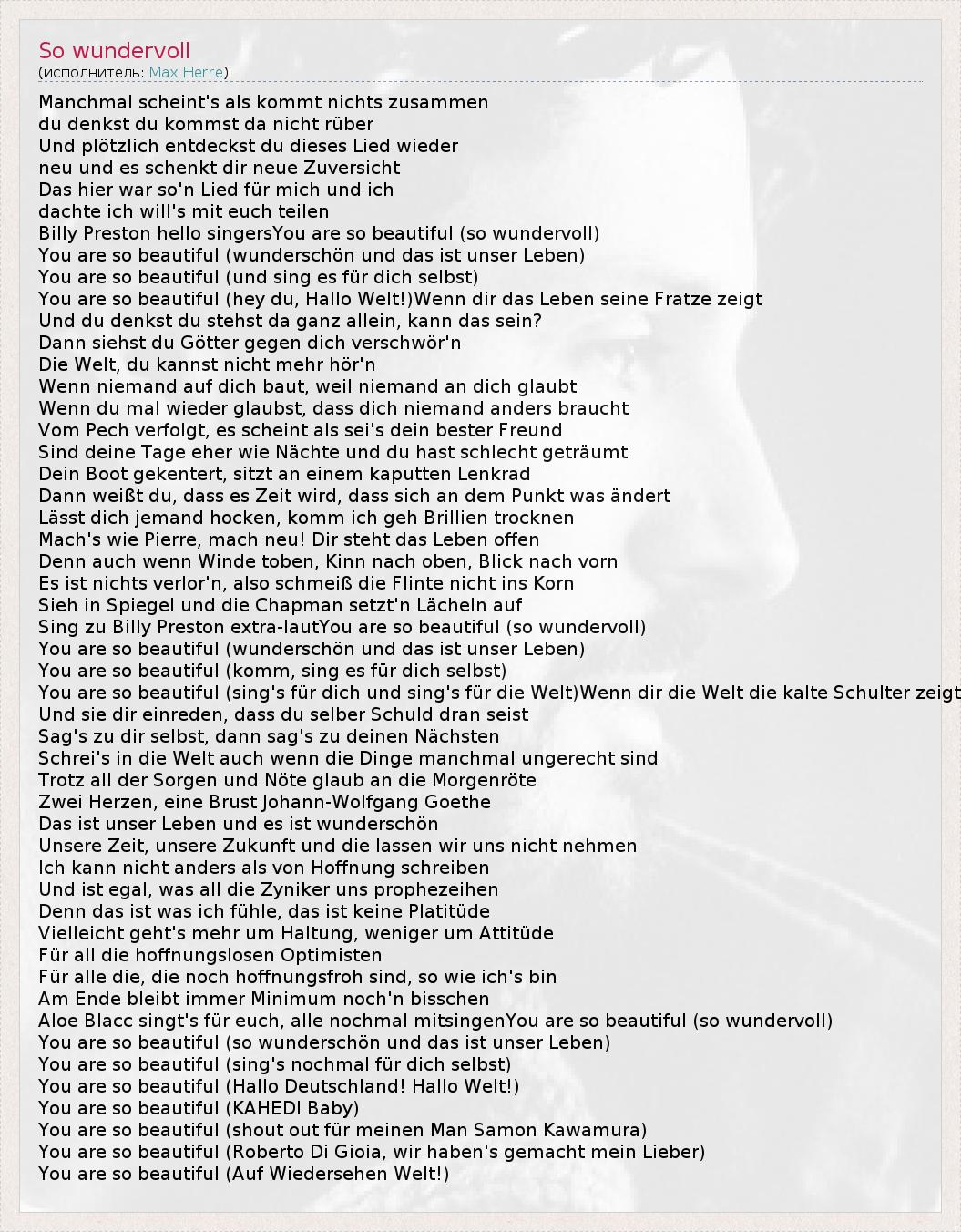 Manchmal scheint's als kommt nichts zusammen du denkst du kommst da nicht rüber Und plötzlich entdeckst du dieses Lied wieder neu und es schenkt dir neue Zuversicht Das hier war so'n Lied für mich und ich dachte ich will's mit euch teilen Billy Preston hello singersYou are so beautiful (so wundervoll) You are so beautiful (wunderschön und das ist unser Leben) You are so beautiful (und sing es für dich selbst) You are so beautiful (hey du, Hallo Welt!)Wenn dir das Leben seine Fratze zeigt Und du denkst du stehst da ganz allein, kann das sein? Dann siehst du Götter gegen dich verschwör'n Die Welt, du kannst nicht mehr hör'n Wenn niemand auf dich baut, weil niemand an dich glaubt Wenn du mal wieder glaubst, dass dich niemand anders braucht Vom Pech verfolgt, es scheint als sei's dein bester Freund Sind deine Tage eher wie Nächte und du hast schlecht geträumt Dein Boot gekentert, sitzt an einem kaputten Lenkrad Dann weißt du, dass es Zeit wird, dass sich an dem Punkt was ändert Lässt dich jemand hocken, komm ich geh Brillien trocknen Mach's wie Pierre, mach neu! Dir steht das Leben offen Denn auch wenn Winde toben, Kinn nach oben, Blick nach vorn Es ist nichts verlor'n, also schmeiß die Flinte nicht ins Korn Sieh in Spiegel und die Chapman setzt'n Lächeln auf Sing zu Billy Preston extra-lautYou are so beautiful (so wundervoll) You are so beautiful (wunderschön und das ist unser Leben) You are so beautiful (komm, sing es für dich selbst) You are so beautiful (sing's für dich und sing's für die Welt)Wenn dir die Welt die kalte Schulter zeigt Und sie dir einreden, dass du selber Schuld dran seist Sag's zu dir selbst, dann sag's zu deinen Nächsten Schrei's in die Welt auch wenn die Dinge manchmal ungerecht sind Trotz all der Sorgen und Nöte glaub an die Morgenröte Zwei Herzen, eine Brust Johann-Wolfgang Goethe Das ist unser Leben und es ist wunderschön Unsere Zeit, unsere Zukunft und die lassen wir uns nicht nehmen Ich kann nicht anders als von Hoffnung schreiben Und ist egal, was all die Zyniker uns prophezeihen Denn das ist was ich fühle, das ist keine Platitüde Vielleicht geht's mehr um Haltung, weniger um Attitüde Für all die hoffnungslosen Optimisten Für alle die, die noch hoffnungsfroh sind, so wie ich's bin Am Ende bleibt immer Minimum noch'n bisschen Aloe Blacc singt's für euch, alle nochmal mitsingenYou are so beautiful (so wundervoll) You are so beautiful (so wunderschön und das ist unser Leben) You are so beautiful (sing's nochmal für dich selbst) You are so beautiful (Hallo Deutschland! Hallo Welt!) You are so beautiful (KAHEDI Baby) You are so beautiful (shout out für meinen Man Samon Kawamura) You are so beautiful (Roberto Di Gioia, wir haben's gemacht mein Lieber) You are so beautiful (Auf Wiedersehen Welt!)