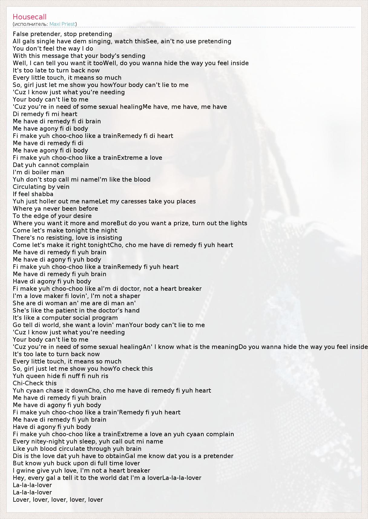 False pretender, stop pretending All gals single have dem singing, watch thisSee, ain't no use pretending You don't feel the way I do With this message that your body's sending Well, I can tell you want it tooWell, do you wanna hide the way you feel inside It's too late to turn back now Every little touch, it means so much So, girl just let me show you howYour body can't lie to me 'Cuz I know just what you're needing Your body can't lie to me 'Cuz you're in need of some sexual healingMe have, me have, me have Di remedy fi mi heart Me have di remedy fi di brain Me have agony fi di body Fi make yuh choo-choo like a trainRemedy fi di heart Me have di remedy fi di Me have agony fi di body Fi make yuh choo-choo like a trainExtreme a love Dat yuh cannot complain I'm di boiler man Yuh don't stop call mi nameI'm like the blood Circulating by vein If feel shabba Yuh just holler out me nameLet my caresses take you places Where ya never been before To the edge of your desire Where you want it more and moreBut do you want a prize, turn out the lights Come let's make tonight the night There's no resisting, love is insisting Come let's make it right tonightCho, cho me have di remedy fi yuh heart Me have di remedy fi yuh brain Me have di agony fi yuh body Fi make yuh choo-choo like a trainRemedy fi yuh heart Me have di remedy fi yuh brain Have di agony fi yuh body Fi make yuh choo-choo like aI'm di doctor, not a heart breaker I'm a love maker fi lovin', I'm not a shaper She are di woman an' me are di man an' She's like the patient in the doctor's hand It's like a computer social program Go tell di world, she want a lovin' manYour body can't lie to me 'Cuz I know just what you're needing Your body can't lie to me 'Cuz you're in need of some sexual healingAn' I know what is the meaningDo you wanna hide the way you feel inside It's too late to turn back now Every little touch, it means so much So, girl just let me show you howYo check this Yuh queen hide fi nuff fi nuh ris Chi-Check this Yuh cyaan chase it downCho, cho me have di remedy fi yuh heart Me have di remedy fi yuh brain Me have di agony fi yuh body Fi make yuh choo-choo like a train'Remedy fi yuh heart Me have di remedy fi yuh brain Have di agony fi yuh body Fi make yuh choo-choo like a trainExtreme a love an yuh cyaan complain Every nitey-night yuh sleep, yuh call out mi name Like yuh blood circulate through yuh brain Dis is the love dat yuh have to obtainGal me know dat you is a pretender But know yuh buck upon di full time lover I gwine give yuh love, I'm not a heart breaker Hey, every gal a tell it to the world dat I'm a loverLa-la-la-lover La-la-la-lover La-la-la-lover Lover, lover, lover, lover, lover