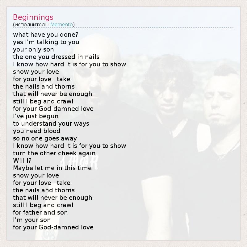 Это интересно:Группа Memento образована в 2001 году в Австралии вокалистом Джастином Стюартом Котта (Justin Stewart Cotta), гитаристом Спейсом (Space), бассистом Лайтаном Кирнсом (Leighton Kearns) и ударником Стивом Кларком (Steve Clark).Свой дебютный альбом Beginnings группа выпустила 25 февраля 2003 года. Два сингла Nothing Sacred и Savior оказались очень удачными, было снято видео на песню Coming.Летом 2003 года группа выступила на легендарном... продолжение