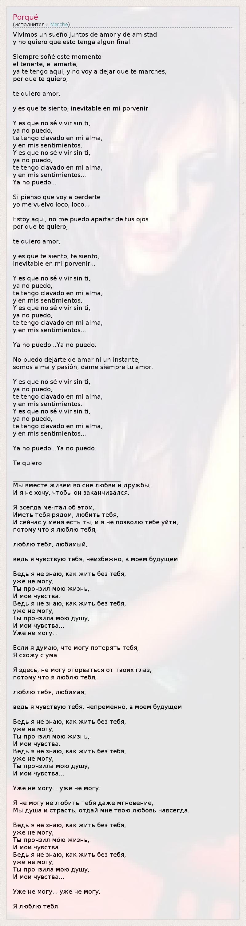 Vivimos un sueño juntos de amor y de amistad y no quiero que esto tenga algun final. Siempre soñé este momento el tenerte, el amarte, ya te tengo aqui, y no voy a dejar que te marches, por que te quiero, te quiero amor, y es que te siento, inevitable en mi porvenir Y es que no sé vivir sin ti, ya no puedo, te tengo clavado en mi alma, y en mis sentimientos. Y es que no sé vivir sin ti, ya no puedo, te tengo clavado en mi alma, y en mis sentimientos... Ya no puedo... Si pienso que voy a perderte yo me vuelvo loco, loco... Estoy aqui, no me puedo apartar de tus ojos por que te quiero, te quiero amor, y es que te siento, te siento, inevitable en mi porvenir... Y es que no sé vivir sin ti, ya no puedo, te tengo clavado en mi alma, y en mis sentimientos. Y es que no sé vivir sin ti, ya no puedo, te tengo clavado en mi alma, y en mis sentimientos... Ya no puedo...Ya no puedo. No puedo dejarte de amar ni un instante, somos alma y pasión, dame siempre tu amor. Y es que no sé vivir sin ti, ya no puedo, te tengo clavado en mi alma, y en mis sentimientos. Y es que no sé vivir sin ti, ya no puedo, te tengo clavado en mi alma, y en mis sentimientos... Ya no puedo...Ya no puedo Te quiero ___________________________________ Мы вместе живем во сне любви и дружбы, И я не хочу, чтобы он заканчивался. Я всегда мечтал об этом, Иметь тебя рядом, любить тебя, И сейчас у меня есть ты, и я не позволю тебе уйти, потому что я люблю тебя, люблю тебя, любимый, ведь я чувствую тебя, неизбежно, в моем будущем Ведь я не знаю, как жить без тебя, уже не могу, Ты пронзил мою жизнь, И мои чувства. Ведь я не знаю, как жить без тебя, уже не могу, Ты пронзила мою душу, И мои чувства... Уже не могу... Если я думаю, что могу потерять тебя, Я схожу с ума. Я здесь, не могу оторваться от твоих глаз, потому что я люблю тебя, люблю тебя, любимая, ведь я чувствую тебя, непременно, в моем будущем Ведь я не знаю, как жить без тебя, уже не могу, Ты пронзил мою жизнь, И мои чувства. Ведь я не знаю, как жить без тебя, уже не могу, Ты пронзила мою душу, И мои чувства... Уже не могу... уже не могу. Я не могу не любить тебя даже мгновение, Мы душа и страсть, отдай мне твою любовь навсегда. Ведь я не знаю, как жить без тебя, уже не могу, Ты пронзил мою жизнь, И мои чувства. Ведь я не знаю, как жить без тебя, уже не могу, Ты пронзила мою душу, И мои чувства... Уже не могу... уже не могу. Я люблю тебя