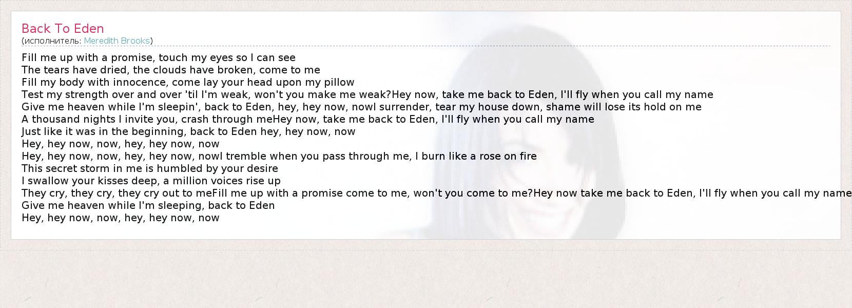 Fill me up with a promise, touch my eyes so I can see The tears have dried, the clouds have broken, come to me Fill my body with innocence, come lay your head upon my pillow Test my strength over and over 'til I'm weak, won't you make me weak?Hey now, take me back to Eden, I'll fly when you call my name Give me heaven while I'm sleepin', back to Eden, hey, hey now, nowI surrender, tear my house down, shame will lose its hold on me A thousand nights I invite you, crash through meHey now, take me back to Eden, I'll fly when you call my name Just like it was in the beginning, back to Eden hey, hey now, now Hey, hey now, now, hey, hey now, now Hey, hey now, now, hey, hey now, nowI tremble when you pass through me, I burn like a rose on fire This secret storm in me is humbled by your desire I swallow your kisses deep, a million voices rise up They cry, they cry, they cry out to meFill me up with a promise come to me, won't you come to me?Hey now take me back to Eden, I'll fly when you call my name Give me heaven while I'm sleeping, back to Eden Hey, hey now, now, hey, hey now, now