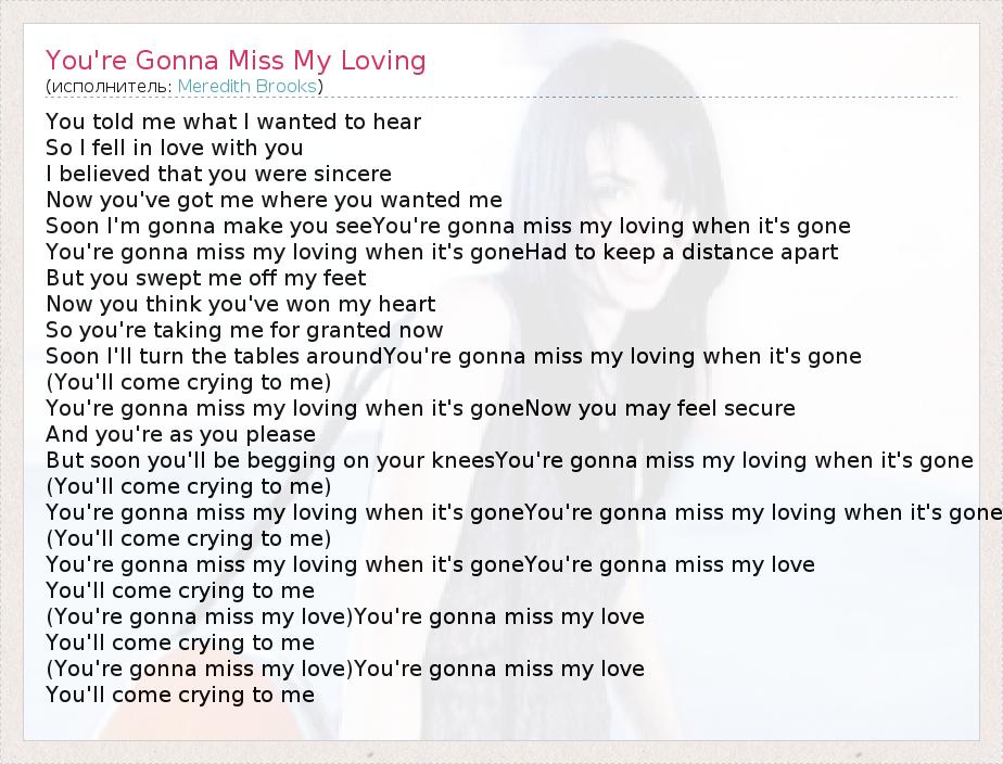 You're gonna miss my loving when it's goneYou're gonna miss my loving when it's gone