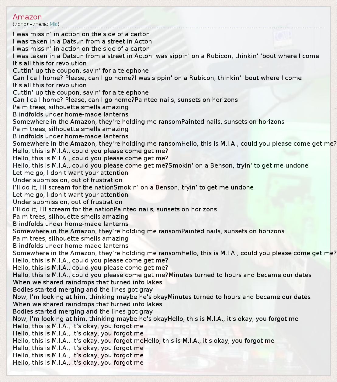 Somewhere in the Amazon, they're holding me ransomHello, this is M.I.A., could you please come get me?