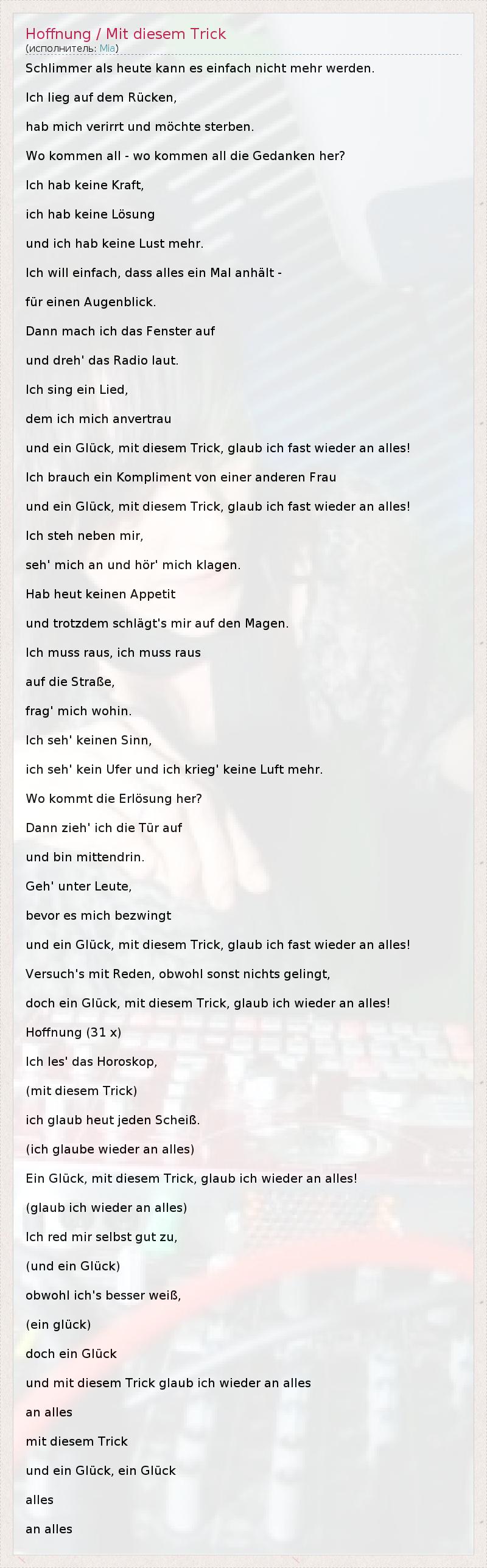 ГлавнаяИсполнителиMiaHoffnung / Mit diesem Trick