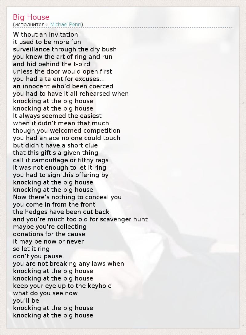 Without an invitation it used to be more fun surveillance through the dry bush you knew the art of ring and run and hid behind the t-bird unless the door would open first you had a talent for excuses... an innocent who'd been coerced you had to have it all rehearsed when knocking at the big house knocking at the big house It always seemed the easiest when it didn't mean that much though you welcomed competition you had an ace no one could touch but didn't have a short clue that this gift's a given thing call it camouflage or filthy rags it was not enough to let it ring you had to sign this offering by knocking at the big house knocking at the big house Now there's nothing to conceal you you come in from the front the hedges have been cut back and you're much too old for scavenger hunt maybe you're collecting donations for the cause it may be now or never so let it ring don't you pause you are not breaking any laws when knocking at the big house knocking at the big house keep your eye up to the keyhole what do you see now you'll be knocking at the big house knocking at the big house