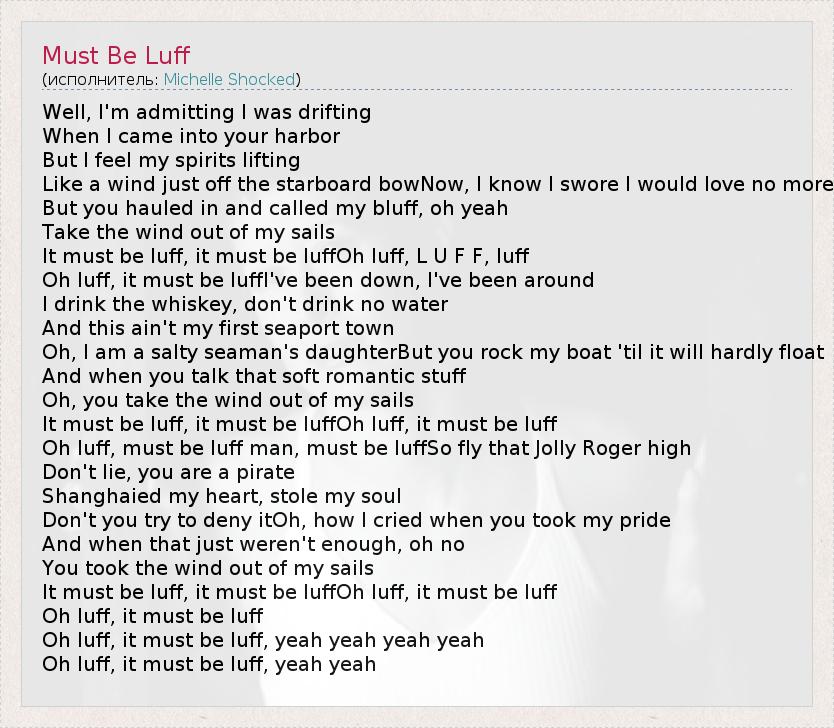 Well, I'm admitting I was drifting When I came into your harbor But I feel my spirits lifting Like a wind just off the starboard bowNow, I know I swore I would love no more But you hauled in and called my bluff, oh yeah Take the wind out of my sails It must be luff, it must be luffOh luff, L U F F, luff Oh luff, it must be luffI've been down, I've been around I drink the whiskey, don't drink no water And this ain't my first seaport town Oh, I am a salty seaman's daughterBut you rock my boat 'til it will hardly float And when you talk that soft romantic stuff Oh, you take the wind out of my sails It must be luff, it must be luffOh luff, it must be luff Oh luff, must be luff man, must be luffSo fly that Jolly Roger high Don't lie, you are a pirate Shanghaied my heart, stole my soul Don't you try to deny itOh, how I cried when you took my pride And when that just weren't enough, oh no You took the wind out of my sails It must be luff, it must be luffOh luff, it must be luff Oh luff, it must be luff Oh luff, it must be luff, yeah yeah yeah yeah Oh luff, it must be luff, yeah yeah