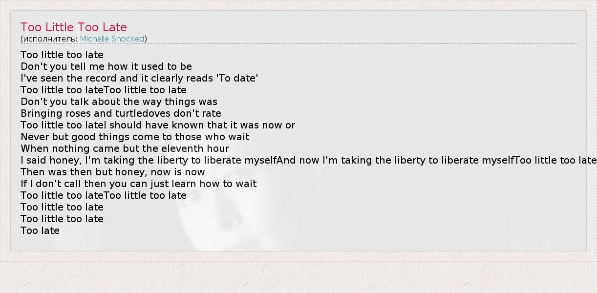 А как ты думаешь, о чем песня "Too Little Too Late" ?