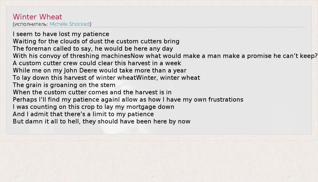 А как ты думаешь, о чем песня "Winter Wheat" ?