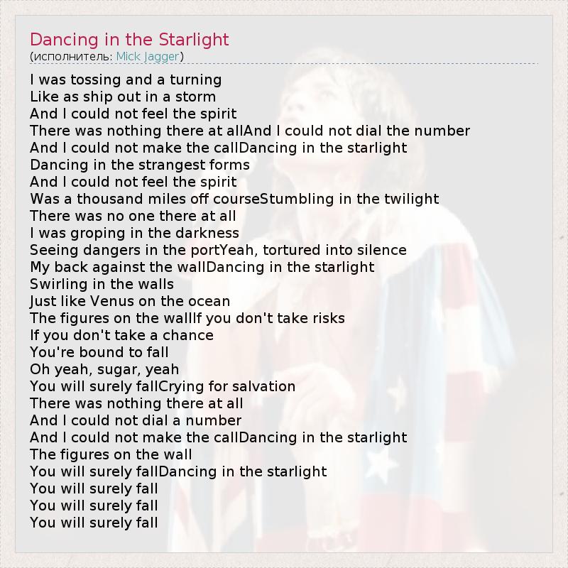 I was tossing and a turning Like as ship out in a storm And I could not feel the spirit There was nothing there at allAnd I could not dial the number And I could not make the callDancing in the starlight Dancing in the strangest forms And I could not feel the spirit Was a thousand miles off courseStumbling in the twilight There was no one there at all I was groping in the darkness Seeing dangers in the portYeah, tortured into silence My back against the wallDancing in the starlight Swirling in the walls Just like Venus on the ocean The figures on the wallIf you don't take risks If you don't take a chance You're bound to fall Oh yeah, sugar, yeah You will surely fallCrying for salvation There was nothing there at all And I could not dial a number And I could not make the callDancing in the starlight The figures on the wall You will surely fallDancing in the starlight You will surely fall You will surely fall You will surely fall