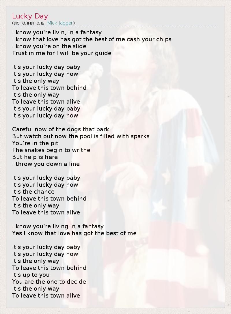 I know you're livin, in a fantasy I know that love has got the best of me cash your chips I know you're on the slide Trust in me for I will be your guide It's your lucky day baby It's your lucky day now It's the only way To leave this town behind It's the only way To leave this town alive It's your lucky day baby It's your lucky day now Careful now of the dogs that park But watch out now the pool is filled with sparks You're in the pit The snakes begin to writhe But help is here I throw you down a line It's your lucky day baby It's your lucky day now It's the chance To leave this town behind It's the only way To leave this town alive I know you're living in a fantasy Yes I know that love has got the best of me It's your lucky day baby It's your lucky day now It's the only way To leave this town behind It's up to you You are the one to decide It's the only way To leave this town alive