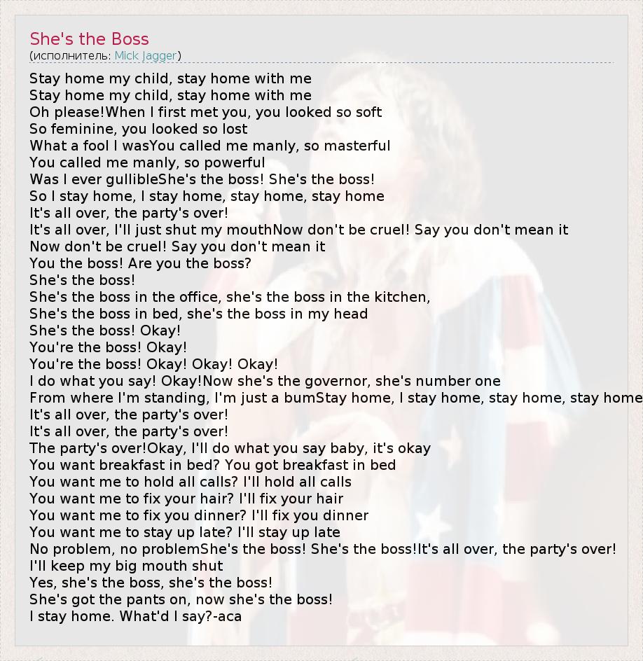 А как ты думаешь, о чем песня "She's the Boss" ?