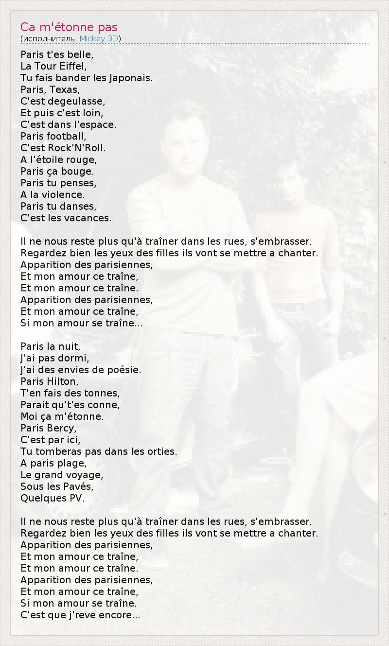 Париж, ты прекрасен, Эйфелева башня, Тобой восхищаются японцы. Париж, Техас - Это отстой, И к тому же далеко, Как до луны пешком. Парижский футбол, Вот Рок-н-ролл. Под красной звездой, Живет Париж. Париж, ты думаешь О насилии. Париж, ты танцуешь По праздникам. Нам остается только бродить по улицам, целоваться. Посмотрите внимательно в глаза девушки, они сейчас запоют. Парижские улицы, Я в вас влюбился навсегда, Я в вас влюбился навсегда. Парижские улицы, Я в вас влюбился навсегда, Я в вас влюбился, надеюсь, что навсегда. Ночной Париж, Не позволяет уснуть, Хочется писать стихи. Пэрис Хилтон, Ты из кожи вон лезешь, Чтобы казаться дурой, Меня это удивляет. Пари-Берси, Именно здесь, Вы упадете в крапиву. На парижском пляже, Большое путешествие, И под Паве, Кого-то схватит инфаркт. Нам остается только бродить по улицам, целоваться. Посмотрите внимательно в глаза девушки, они сейчас запоют. Парижские улицы, Я в вас влюбился навсегда, Я в вас влюбился навсегда. Парижские улицы, Я в вас влюбился навсегда, Я в вас влюбился, надеюсь, что навсегда. Вот, что мне до сих пор снится...