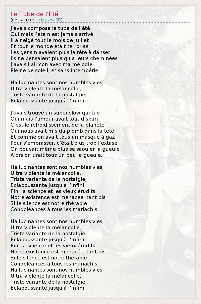 J'avais composé le tube de l'été Oui mais l'été n'est jamais arrivé Il a neigé tout le mois de juillet Et tout le monde était terrorisé Les gens n'avaient plus la tête à danser Ils ne pensaient plus qu'à leurs cheminées J'avais l'air con avec ma mélodie Pleine de soleil, et sans intempérie. Hallucinantes sont nos humbles vies, Ultra violente la mélancolie, Triste variante de la nostalgie, Eclaboussante jusqu'à l'infini. J'avais trouvé un super slow qui tue Oui mais l'amour avait tout disparu C'est le refroidissement de la planète Qui nous avait mis du plomb dans la tête Et comme on avait tous un masque à gaz Pour s'embrasser, c'était plus trop l'extase On pouvait même plus se saouler la gueule Alors on tirait tous un peu la gueule. Hallucinantes sont nos humbles vies, Ultra violente la mélancolie, Triste variante de la nostalgie, Eclaboussante jusqu'à l'infini Fini la science et les vieux érudits Notre existence est menacée, tant pis Si le silence est notre thérapie Condoléances à tous les mariachis. Hallucinantes sont nos humbles vies, Ultra violente la mélancolie, Triste variante de la nostalgie, Eclaboussante jusqu'à l'infini Fini la science et les vieux érudits Notre existence est menacée, tant pis Si le silence est notre thérapie Condoléances à tous les mariachis. Hallucinantes sont nos humbles vies, Ultra violente la mélancolie, Triste variante de la nostalgie, Eclaboussante jusqu'à l'infini.