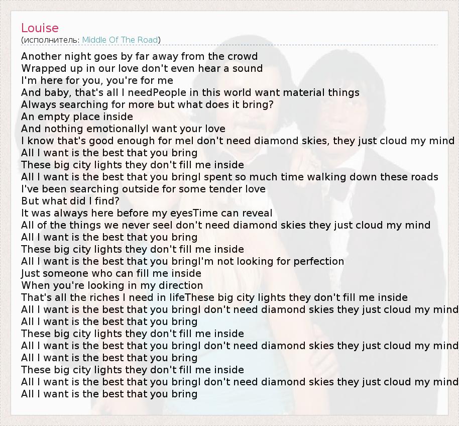 Another night goes by far away from the crowd Wrapped up in our love don't even hear a sound I'm here for you, you're for me And baby, that's all I needPeople in this world want material things Always searching for more but what does it bring? An empty place inside And nothing emotionallyI want your love I know that's good enough for meI don't need diamond skies, they just cloud my mind All I want is the best that you bring These big city lights they don't fill me inside All I want is the best that you bringI spent so much time walking down these roads I've been searching outside for some tender love But what did I find? It was always here before my eyesTime can reveal All of the things we never seeI don't need diamond skies they just cloud my mind All I want is the best that you bring These big city lights they don't fill me inside All I want is the best that you bringI'm not looking for perfection Just someone who can fill me inside When you're looking in my direction That's all the riches I need in lifeThese big city lights they don't fill me inside All I want is the best that you bringI don't need diamond skies they just cloud my mind All I want is the best that you bring These big city lights they don't fill me inside All I want is the best that you bringI don't need diamond skies they just cloud my mind All I want is the best that you bring These big city lights they don't fill me inside All I want is the best that you bringI don't need diamond skies they just cloud my mind All I want is the best that you bring