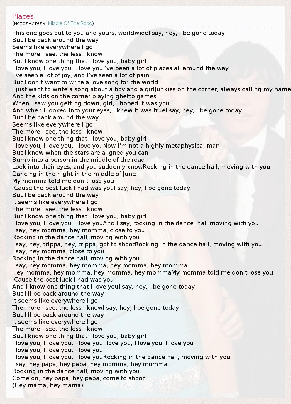 This one goes out to you and yours, worldwideI say, hey, I be gone today But I be back around the way Seems like everywhere I go The more I see, the less I know But I know one thing that I love you, baby girl I love you, I love you, I love youI've been a lot of places all around the way I've seen a lot of joy, and I've seen a lot of pain But I don't want to write a love song for the world I just want to write a song about a boy and a girlJunkies on the corner, always calling my name And the kids on the corner playing ghetto games When I saw you getting down, girl, I hoped it was you And when I looked into your eyes, I knew it was trueI say, hey, I be gone today But I be back around the way Seems like everywhere I go The more I see, the less I know But I know one thing that I love you, baby girl I love you, I love you, I love youNow I'm not a highly metaphysical man But I know when the stars are aligned you can Bump into a person in the middle of the road Look into their eyes, and you suddenly knowRocking in the dance hall, moving with you Dancing in the night in the middle of June My momma told me don't lose you 'Cause the best luck I had was youI say, hey, I be gone today But I be back around the way It seems like everywhere I go The more I see, the less I know But I know one thing that I love you, baby girl I love you, I love you, I love youAnd I say, rocking in the dance, hall moving with you I say, hey momma, hey momma, close to you Rocking in the dance hall, moving with you I say, hey, trippa, hey, trippa, got to shootRocking in the dance hall, moving with you I say, hey momma, close to you Rocking in the dance hall, moving with you I say, hey momma, hey momma, hey momma, hey momma Hey momma, hey momma, hey momma, hey mommaMy momma told me don't lose you 'Cause the best luck I had was you And I know one thing that I love youI say, hey, I be gone today But I'll be back around the way It seems like everywhere I go The more I see, the less I knowI say, hey, I be gone today But I'll be back around the way It seems like everywhere I go The more I see, the less I know But I know one thing that I love you, baby girl I love you, I love you, I love youI love you, I love you, I love you I love you, I love you, I love you I love you, I love you, I love youRocking in the dance hall, moving with you I say, hey papa, hey papa, hey momma, hey momma Rocking in the dance hall, moving with you Come on, hey papa, hey papa, come to shoot (Hey mama, hey mama)