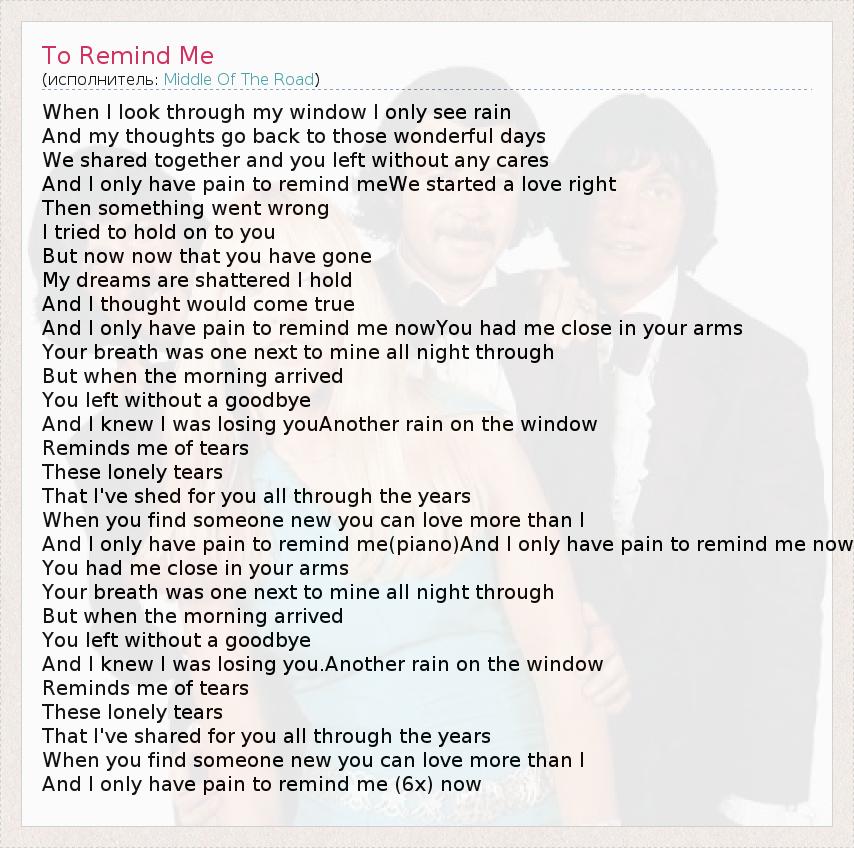 When I look through my window I only see rain And my thoughts go back to those wonderful days We shared together and you left without any cares And I only have pain to remind meWe started a love right Then something went wrong I tried to hold on to you But now now that you have gone My dreams are shattered I hold And I thought would come true And I only have pain to remind me nowYou had me close in your arms Your breath was one next to mine all night through But when the morning arrived You left without a goodbye And I knew I was losing youAnother rain on the window Reminds me of tears These lonely tears That I've shed for you all through the years When you find someone new you can love more than I And I only have pain to remind me(piano)And I only have pain to remind me now You had me close in your arms Your breath was one next to mine all night through But when the morning arrived You left without a goodbye And I knew I was losing you.Another rain on the window Reminds me of tears These lonely tears That I've shared for you all through the years When you find someone new you can love more than I And I only have pain to remind me (6x) now
