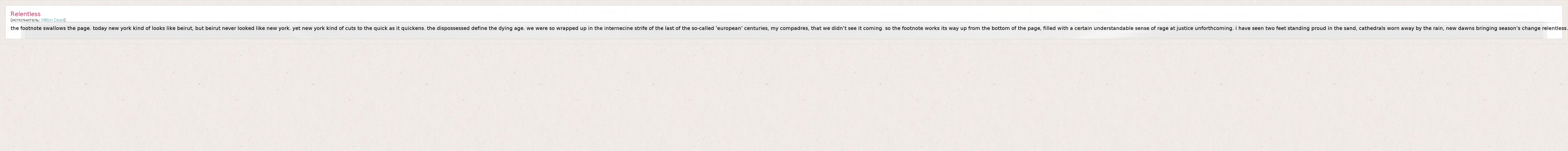the footnote swallows the page. today new york kind of looks like beirut, but beirut never looked like new york. yet new york kind of cuts to the quick as it quickens. the dispossessed define the dying age. we were so wrapped up in the internecine strife of the last of the so-called 'european' centuries, my compadres, that we didn't see it coming. so the footnote works its way up from the bottom of the page, filled with a certain understandable sense of rage at justice unforthcoming. i have seen two feet standing proud in the sand, cathedrals worn away by the rain, new dawns bringing season's change relentless.