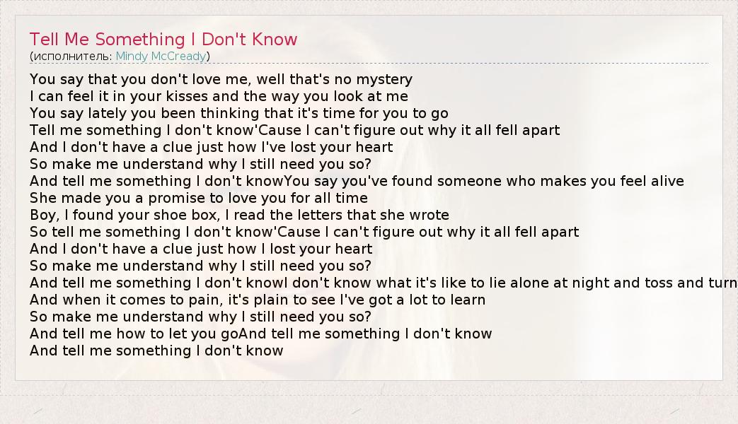 You say that you don't love me, well that's no mystery I can feel it in your kisses and the way you look at me You say lately you been thinking that it's time for you to go Tell me something I don't know'Cause I can't figure out why it all fell apart And I don't have a clue just how I've lost your heart So make me understand why I still need you so? And tell me something I don't knowYou say you've found someone who makes you feel alive She made you a promise to love you for all time Boy, I found your shoe box, I read the letters that she wrote So tell me something I don't know'Cause I can't figure out why it all fell apart And I don't have a clue just how I lost your heart So make me understand why I still need you so? And tell me something I don't knowI don't know what it's like to lie alone at night and toss and turn And when it comes to pain, it's plain to see I've got a lot to learn So make me understand why I still need you so? And tell me how to let you goAnd tell me something I don't know And tell me something I don't know