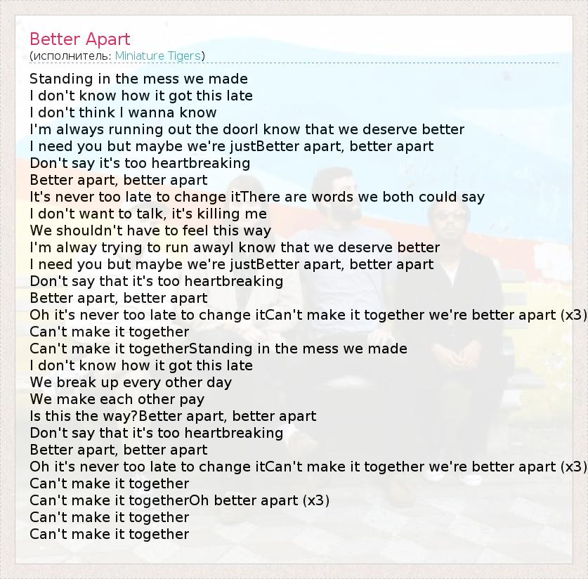 Oh it's never too late to change itCan't make it together we're better apart (x3)