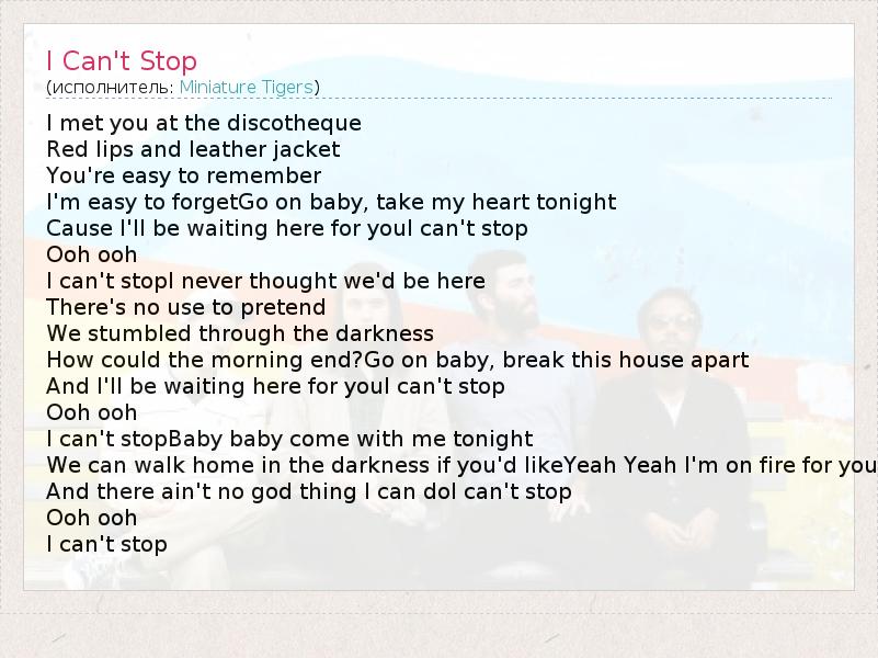 I met you at the discotheque Red lips and leather jacket You're easy to remember I'm easy to forgetGo on baby, take my heart tonight Cause I'll be waiting here for youI can't stop Ooh ooh I can't stopI never thought we'd be here There's no use to pretend We stumbled through the darkness How could the morning end?Go on baby, break this house apart And I'll be waiting here for youI can't stop Ooh ooh I can't stopBaby baby come with me tonight We can walk home in the darkness if you'd likeYeah Yeah I'm on fire for you And there ain't no god thing I can doI can't stop Ooh ooh I can't stop