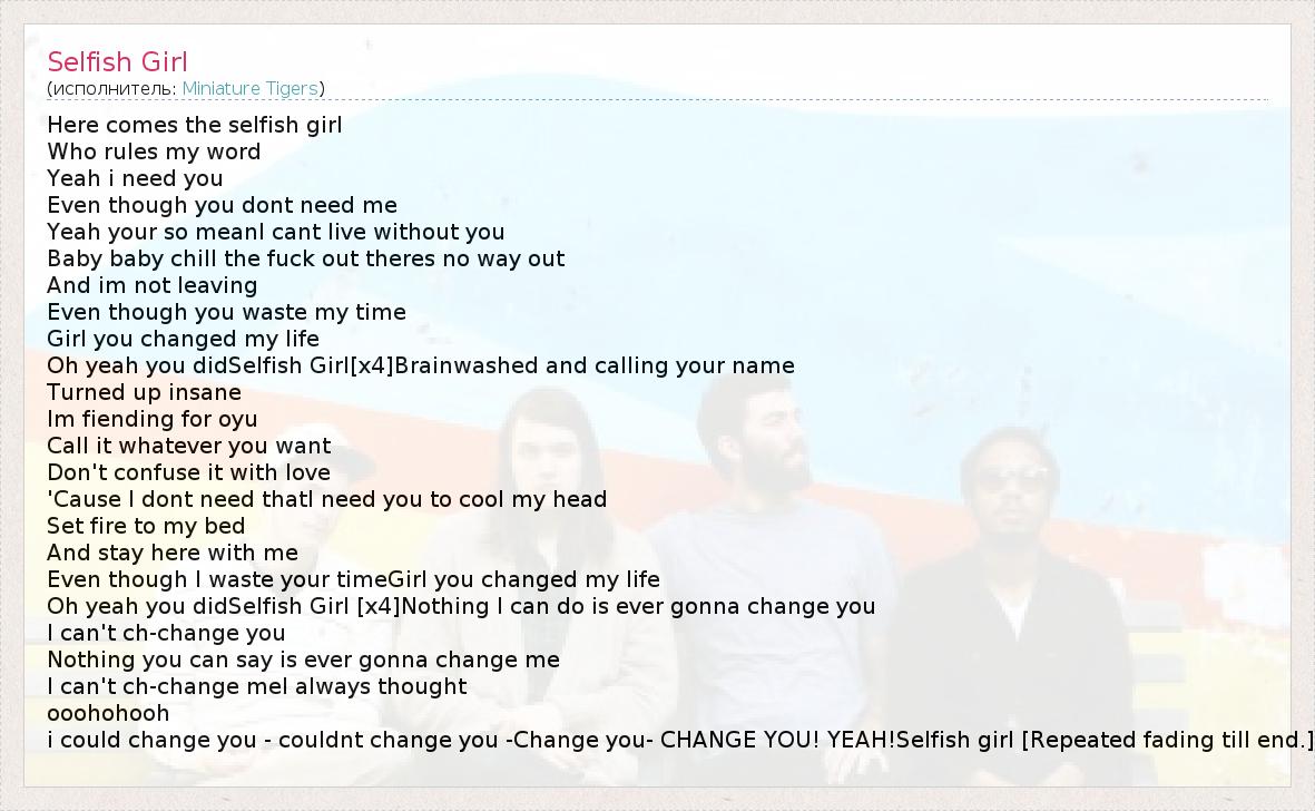 i could change you - couldnt change you -Change you- CHANGE YOU! YEAH!Selfish girl [Repeated fading till end.]