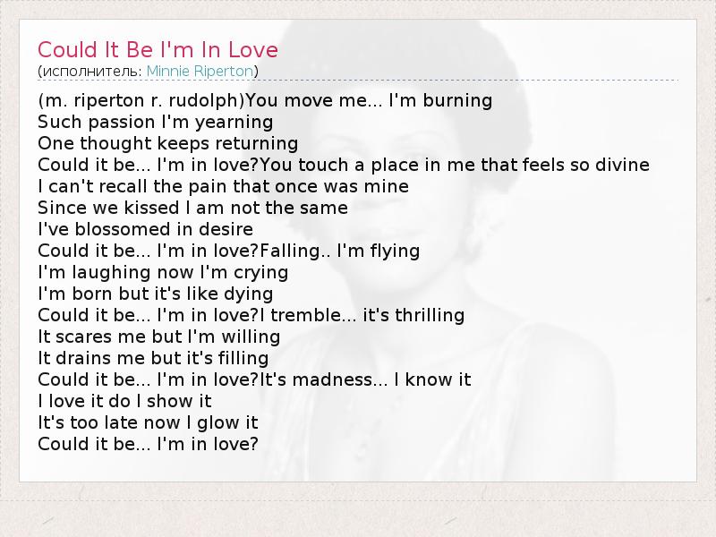 (m. riperton r. rudolph)You move me... I'm burning Such passion I'm yearning One thought keeps returning Could it be... I'm in love?You touch a place in me that feels so divine I can't recall the pain that once was mine Since we kissed I am not the same I've blossomed in desire Could it be... I'm in love?Falling.. I'm flying I'm laughing now I'm crying I'm born but it's like dying Could it be... I'm in love?I tremble... it's thrilling It scares me but I'm willing It drains me but it's filling Could it be... I'm in love?It's madness... I know it I love it do I show it It's too late now I glow it Could it be... I'm in love?