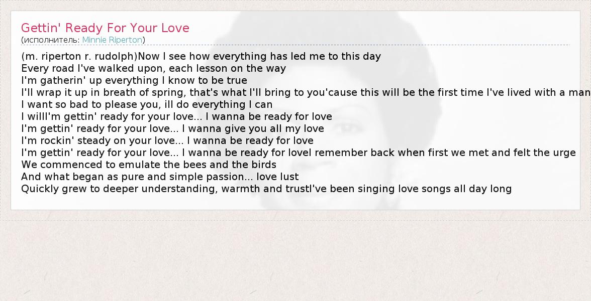 ГлавнаяИсполнителиMinnie RipertonGettin' Ready For Your Love